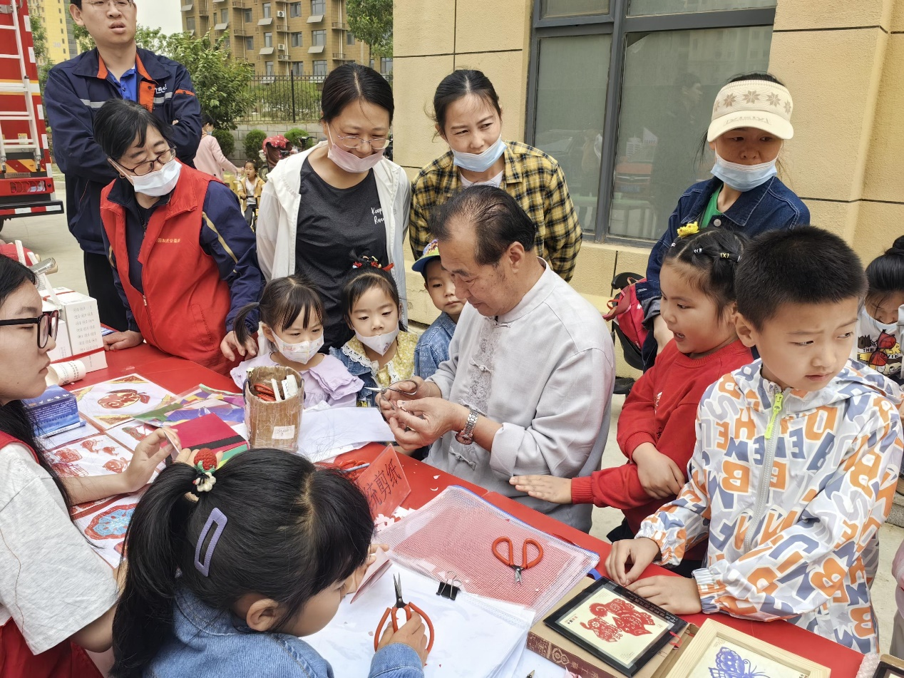 本次活动依托我校“剪纸工作室”,在社区同步设立“社区学院——剪纸小课堂”,开展现场展示和教学活动。活动现场,社区居民对传统工艺兴趣浓厚,韩月湖老师的精美剪纸作品得到了大家的赞叹和喜爱,居民们纷纷上前请教学习。韩月湖老师对每一位居民都耐心讲解、精心指导,活动结束时大家恋恋不舍,建议以后多举办此类活动。