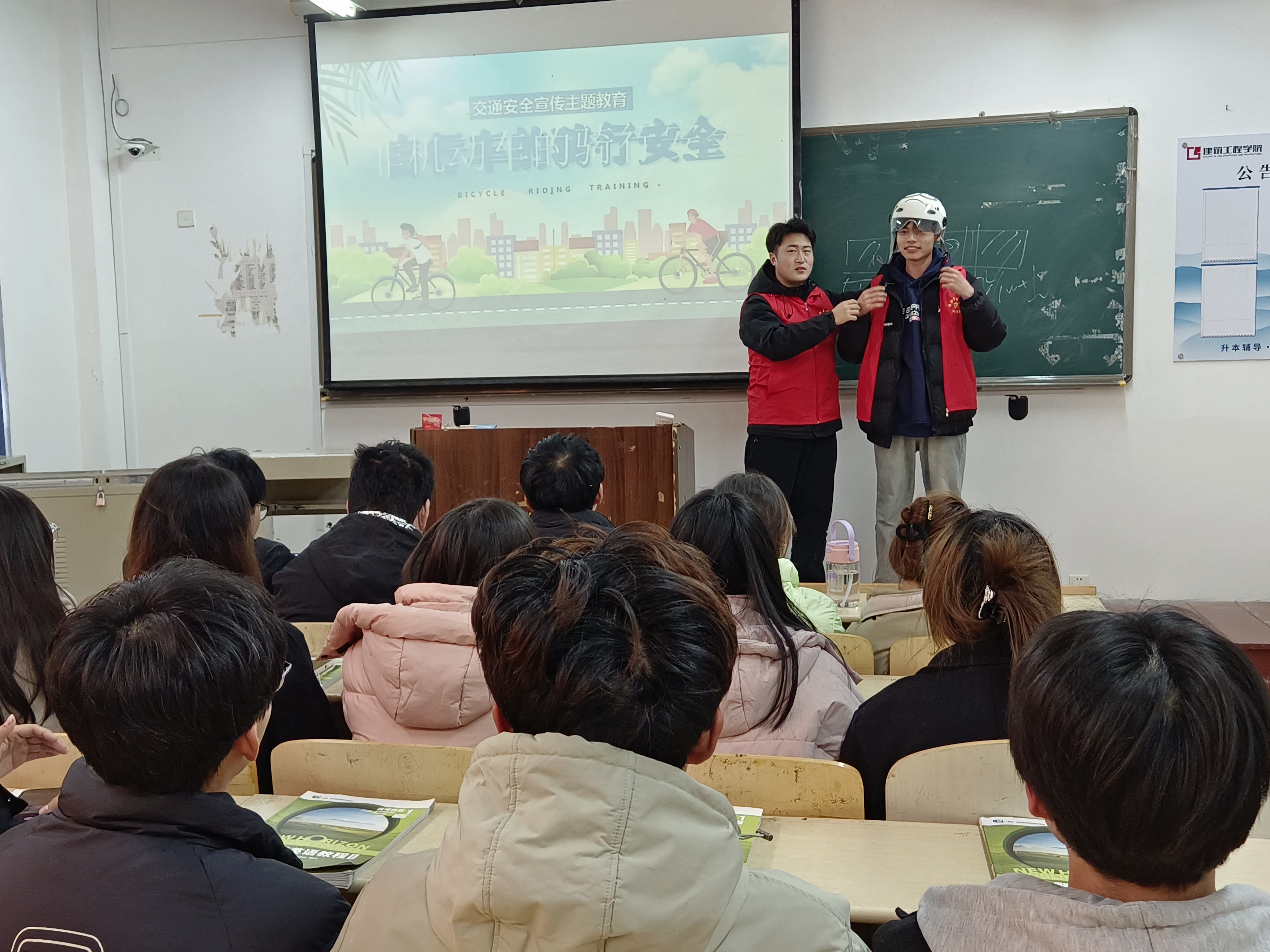 交通蓝,践行安全出行。学院围绕全国第十二个“全国交通日”主题“文明交通,你我同行”,发起“一盔一带”主题宣传活动。志愿者们通过事故案例讲解等形式,向同学们讲解了“一盔一带”的重要性。用通俗易懂的语言说明骑乘电动自行车不戴安全头盔等交通违法行为的危害和严重后果。同时现场示范如何选择及规范佩戴安全头盔,特别是系带卡扣一定要系牢,否则发生交通事故时安全头盔达不到保护头部的作用。通过志愿者和同学们的共同努力,让安全头盔成为电动车出行的标配装备,筑牢生命的防线,远离事故伤害。