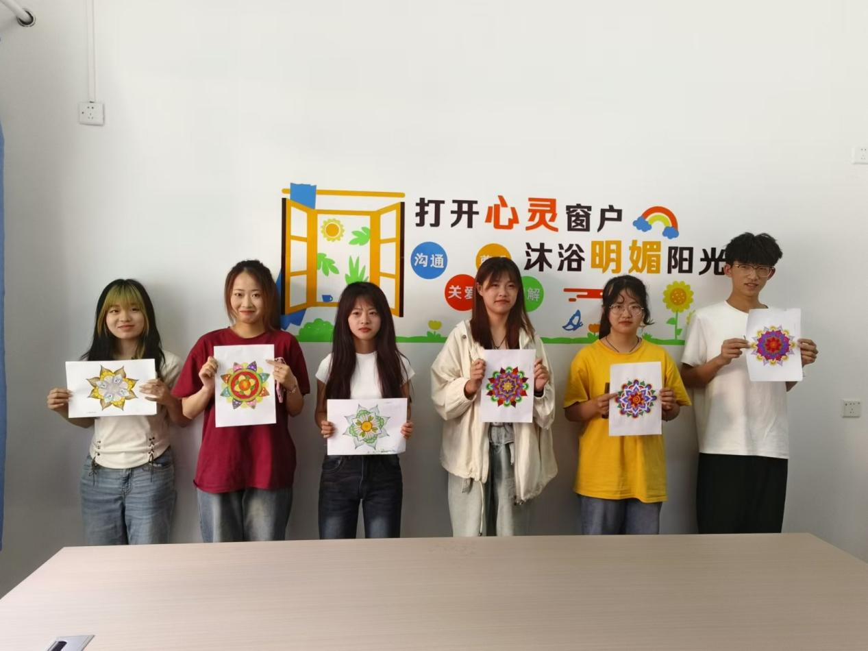 举办曼陀罗绘画疗愈活动。活动以正念冥想导入,同学们在舒缓的音乐中开启创作。每位同学根据自己的心灵体验创作出了不同的曼陀罗样式。绘画完成后,同学们在一起分享创作感受。每一次分享都是深入自我认知的过程,能够借此了解到自己的心理应对模式。