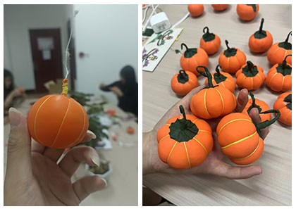 南瓜象征着勤劳、朴实和厚道,因其鲜艳的橙色深受人们喜爱。学院组织学生手工制作南瓜,在认真学习制作视频后,用小气球塞满柔软的棉花,黄色的丝线缠绕出南瓜的纹路,绿色的绸带化作南瓜的枝叶,最后将制作的南瓜挂在藤脉上组成一株完整的南瓜。活动现场热闹而温馨,精美的南瓜鲜艳的色彩温暖着每一名参与者的心灵,这是一次创意手工与传统文化的结合,也是一次追求健康生活的生动诠释。
