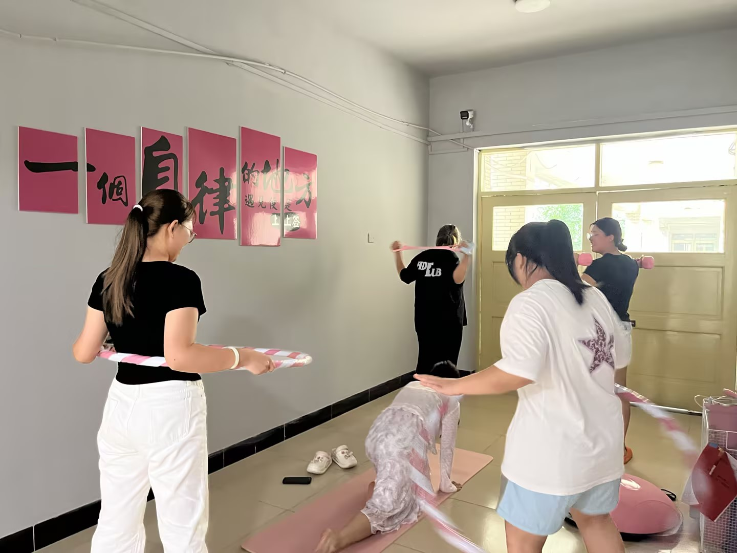 学院在男女生宿舍楼分别设置了布袋健身房,并根据前期学生的调研需求配备了一系列可调节的健身器材,包括哑铃、拉力带、瑜伽垫和平衡球等,适合进行力量训练、有氧运动、塑性训练和柔韧性练习。