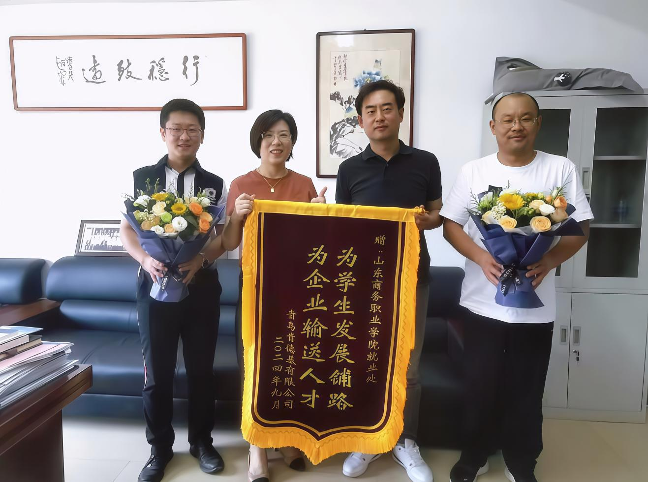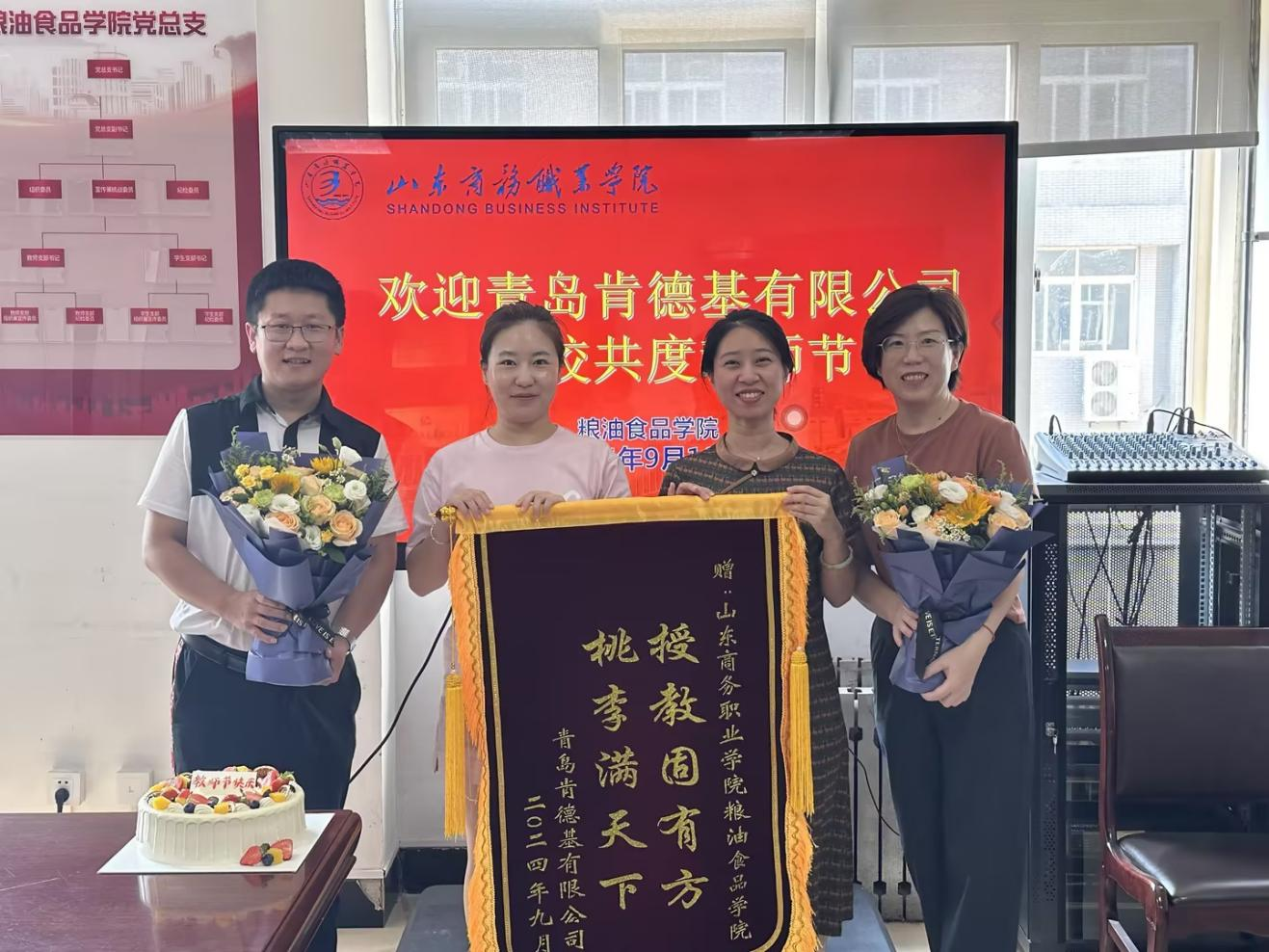 本站讯 9月9日上午,在第40个教师节来临之际,百胜中国控股有限公司山东分公司烟台地区负责人齐翠玲、门店负责人刘杰来到我校洽谈交流,并分别为校企合作与就业工作处和粮油食品学院的老师送上锦旗与节日的祝福。