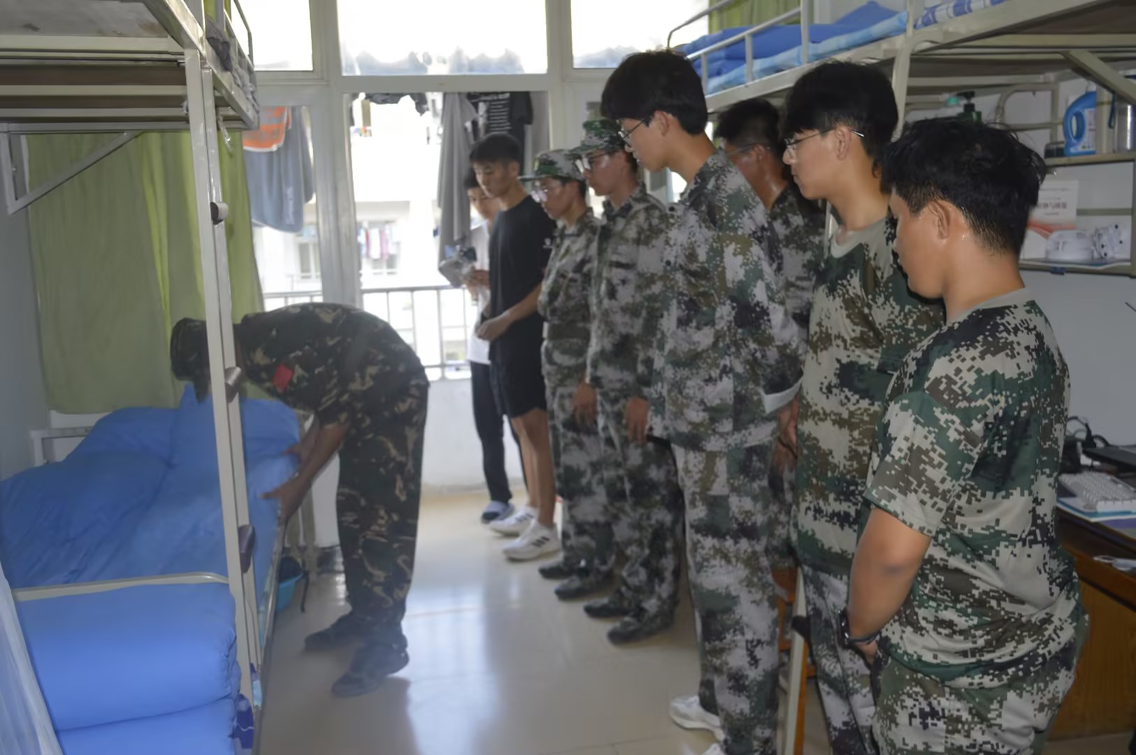 军训教官详细讲解了宿舍内务卫生的具体要求,包括床铺整理、书桌清理、垃圾分类以及公共区域的清洁等。教官在宿舍现场示范,手把手教学,各位同学也根据教官的标准,整理床铺、叠被子、整齐摆放物品、打扫宿舍内部和公共区域卫生。培训期间,辅导员还特别介绍了学院日后将如何定期开展宿舍安全卫生检查,呼吁同学们加强对自身居住环境安全卫生情况的关注,共同营造一个舒适的生活空间。