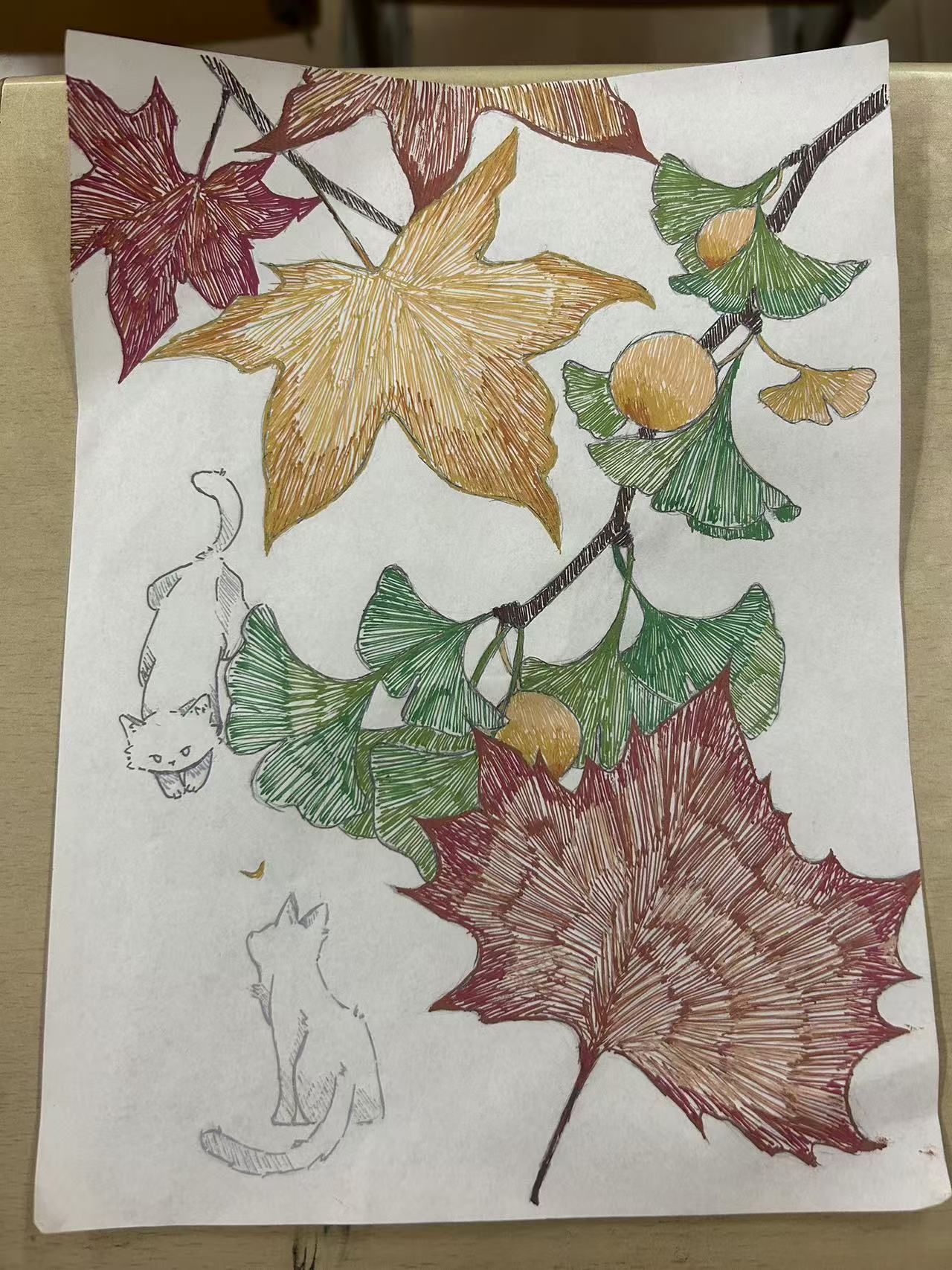 充满诗意的秋韵绘画活动吸引了众多绘画爱好者积极参与。同学们以秋天为主题,尽情挥洒灵感。有的同学用细腻的笔触勾勒出校园里金黄银杏与建筑物相互映衬的美景,金黄的色调将秋日的宁静与庄重表现得淋漓尽致。有的聚焦于秋日的天空,那湛蓝如宝石般的底色上,飘荡着如棉絮般的白云,与南迁的雁阵构成了一幅充满意境的画面。绘画工具在同学们手中像是被赋予了生命,彩铅、水彩、油画棒等交织出一幅幅五彩斑斓的秋日画卷。