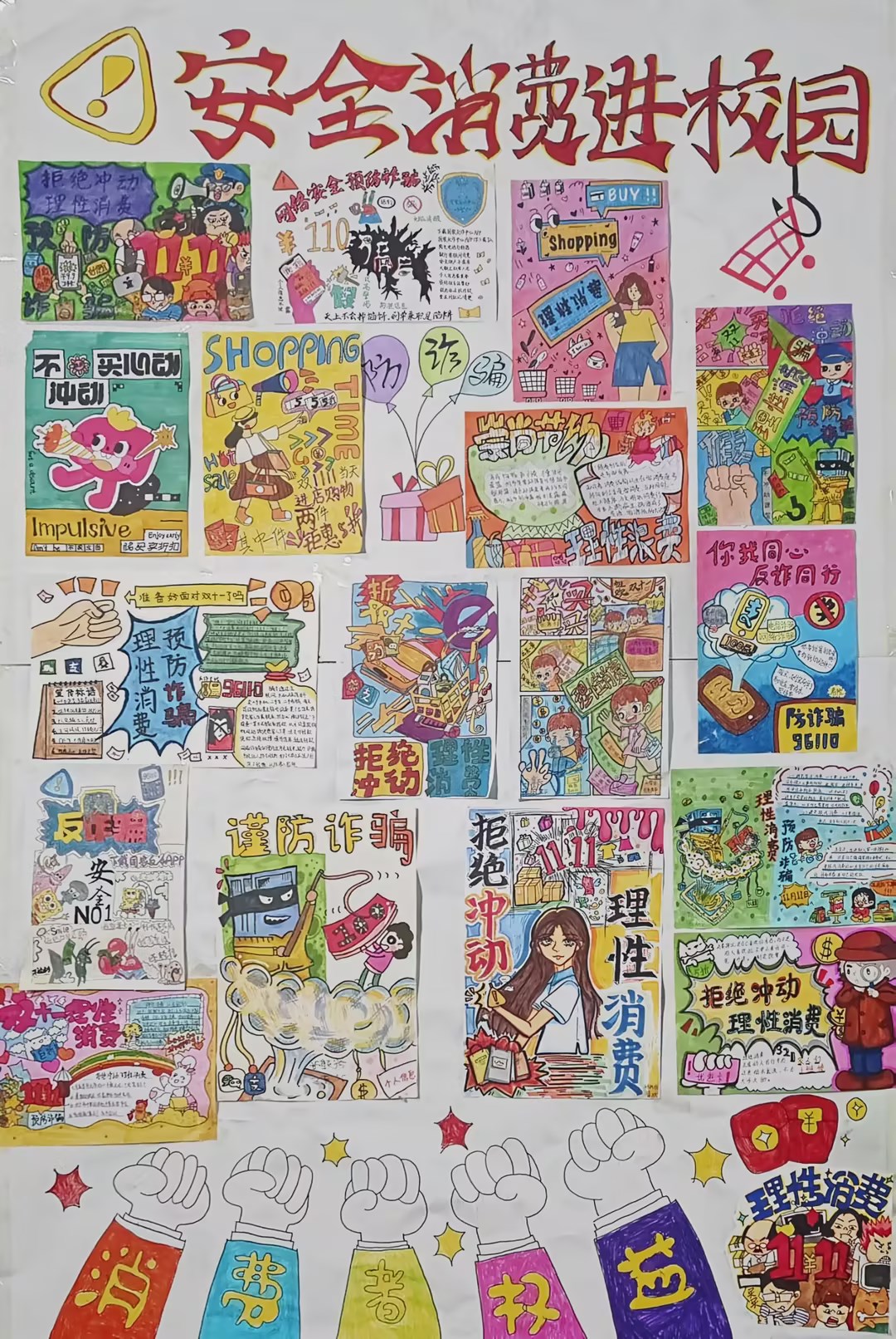 活动中,同学们积极参与,通过画笔和文字传达了理性消费的理念。大家不仅分享了提前列购物清单、对比不同平台价格等实用技巧,还强调了避免过度依赖信贷消费的重要性,以防因超支而陷入经济困境。手抄报内容丰富多样,手抄报用醒目的色彩和图案提醒大家警惕消费冲动,根据实际需求购物,通过详细列举各种诈骗手段,如虚假链接、冒牌客服等,帮助同学们增强识别能力,保护自己的财产安全。