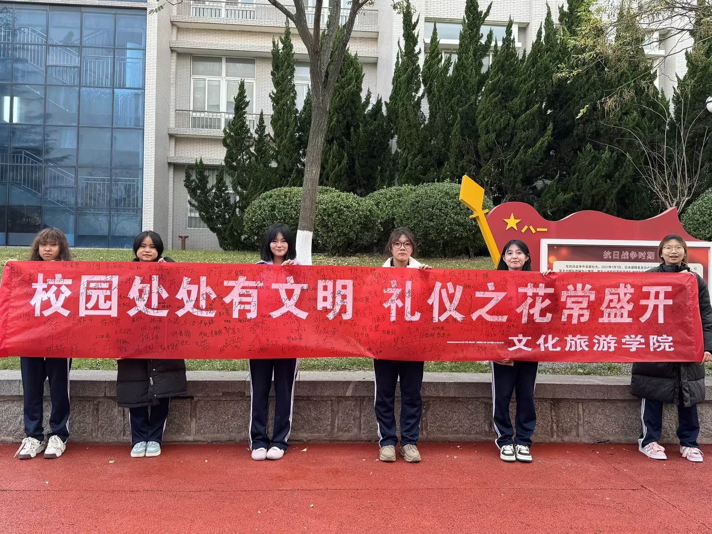 本站讯 为了进一步提升学生的道德素质,营造更加和谐优雅的校园文化氛围,11月20日,文化旅游学院开展了“校园处处有文明 礼仪之花常盛开”主题签名活动。