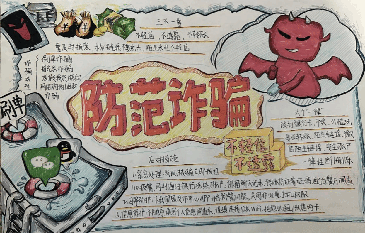 活动期间,同学们围绕刷单、网贷、冒充公检法等常见诈骗类型,以漫画、海报、水彩等多样形式创作,将安全知识与艺术表达完美融合,充分展现了同学们的艺术创造力与对安全问题的深刻理解。其中,24营销1班耿瑜辰的作品—《防范诈骗》,通过鲜明的主题、多元素的表现形式和具有视觉冲击力的色彩搭配,详细介绍了诈骗类型、应对措施等,让读者了解到诈骗手段的多样性、复杂性,从而在日常生活中保持警惕,不轻易上当受骗。经严格评审,最终《防范诈骗》《反诈骗有你有我》等作品获评一等奖,其余共20多部作品获其他奖项,获奖作品不仅展现了学生的艺术才华,更以生动形象的方式呈现了防诈要点。