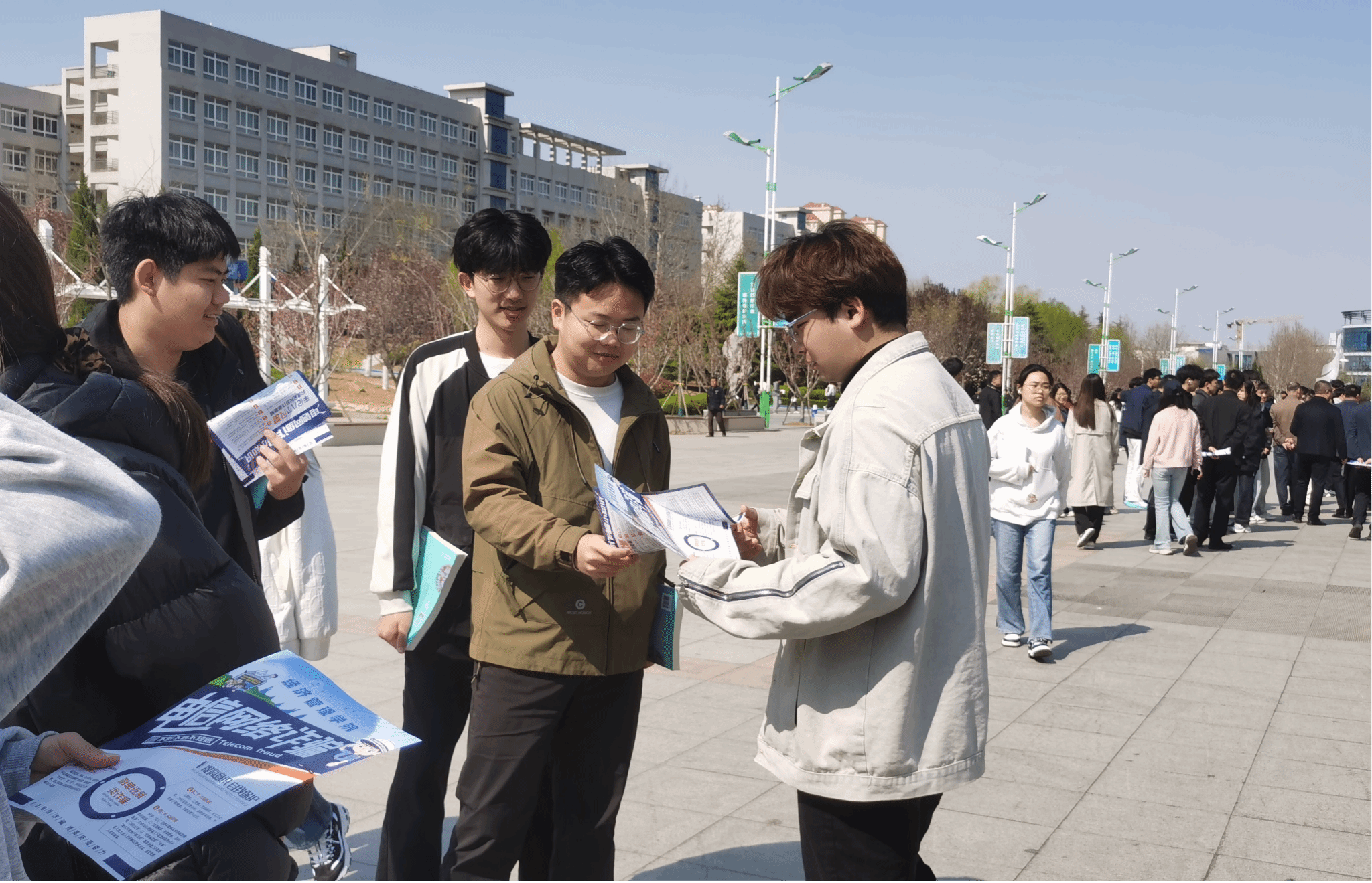 活动日当天,“经小盾”志愿队在中心大道开展了“国家安全 反诈同行”主题宣传活动,同时设有留言板、作品展示区等,将日常学习到的防诈骗知识进一步内化并有效输出。志愿者们手持精心制作的防诈骗宣传手册,热情地向过往师生讲解常见诈骗手段,耐心解答他们提出的疑问,以生动形象的方式向大家普及防范电信网络诈骗的重要性。同时,还通过现场播放学生精心制作的短视频,如“防诈神曲”“反诈情景短剧”等,吸引了众多师生的驻足观看。现场共发放防诈骗宣传单页200余份,播放优秀短视频30余条,收到观众现场留言反馈40多张。