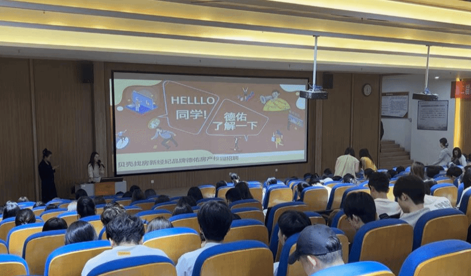随后,作为贝壳平台上门店规模最大的新经济品牌,青岛德佑房产以 “高回报 + 强成长” 为核心卖点吸引学子关注。企业负责人重点介绍职业经纪人岗位,强调 “多劳多得”的激励机制,实习期间提供底薪保障,叠加业绩提成,且为实习生提供住宿支持。在职业发展层面,企业构建了“新人培训—资深进阶—管理晋升”的全周期培养体系,从基础业务技巧到团队管理能力,均配备专业导师指导,助力毕业生完成从行业新人到管理人才的蜕变。