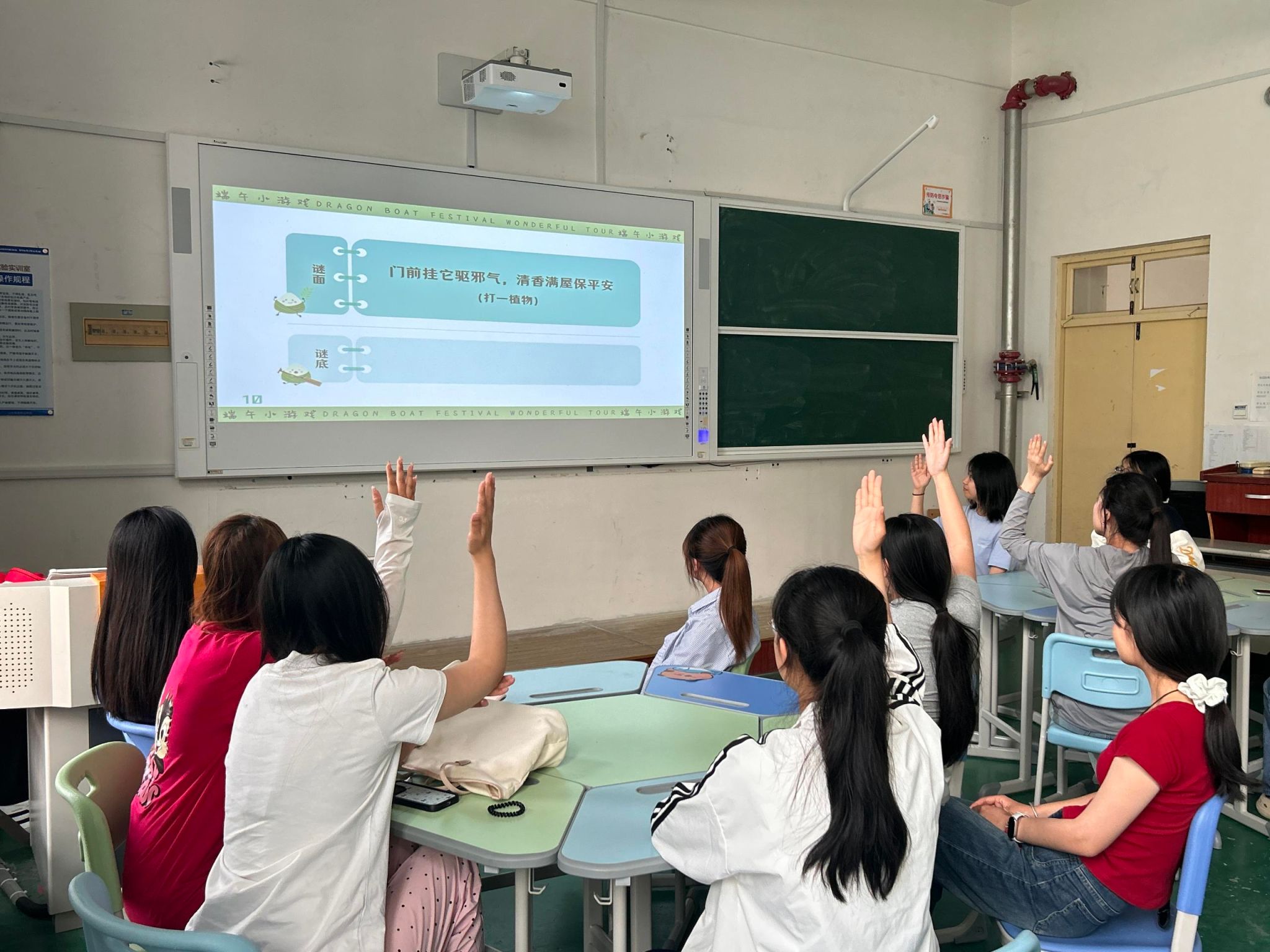 妙问趣答,知识碰撞启新思。“端午快问快答”环节巧妙地将端午文化知识融入紧张刺激的知识竞答。“屈原诗作《离骚》中‘路漫漫其修远兮’的下一句是什么?”“端午佩戴的五彩绳蕴含哪些吉祥寓意?”等兼具知识性与趣味性的问题轮番抛出,同学们或旁征博引,或结合自身对民俗的认识,展开热烈讨论,在轻松愉快的氛围中,让端午文化知识深入人心。
