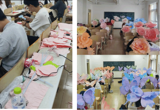 《舞台布景设计》课程打破传统理论教学模式,以项目驱动为导向,引导学生从主题策划、空间规划到材料运用进行全流程实践。课程依托真实校园场景,将扶梯空间作为“教学实验室”,要求学生结合国庆主题进行创意设计。教师团队通过“任务导入—分组协作—成果落地”的教学模式,让学生在实践中掌握设计逻辑、材料工艺与团队协作能力,真正实现“做中学、学中做”。这一变革不仅提升了课堂的趣味性和挑战性,更夯实了职业教育“知行合一”的育人理念。