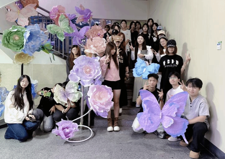 本站讯 艺术设计学院以课程创新为抓手,推动学生专业技能与综合素质协同发展。9月26日,24级环境艺术设计专业学生将《舞台布景设计》课程成果转化为校园实景,在1号教学楼B座扶梯区域打造“艺路生花迎国庆”主题布景展示,以专业实践献礼国庆。