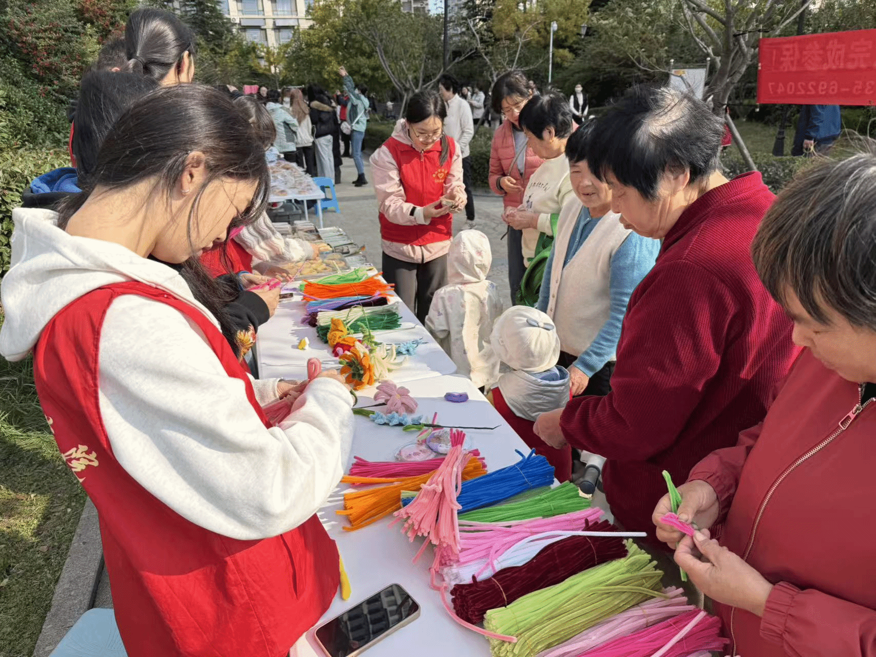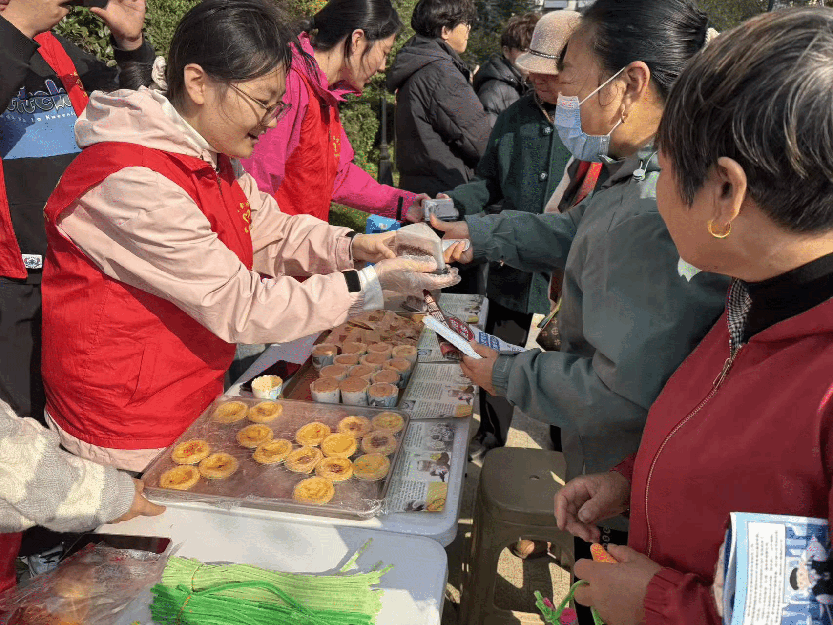 在社区实践环节,志愿服务队聚焦文化传承与民生服务,打造“可看、可品、可感”的三维体验场景。“粮安知识角”系统普及谷物营养、节气膳食、营养搭配等知识,发放《膳食营养指南》,推动科学饮食理念落地生根;师生现场将蕴含现代健康理念的美味糕点赠予社区居民,传递“食养”智慧与人文关怀;“手作创意坊”以扭扭棒为媒,引导居民编织创意作品,让非遗技艺在指尖焕发新生,实现文化传承与情感共鸣的双向奔赴。