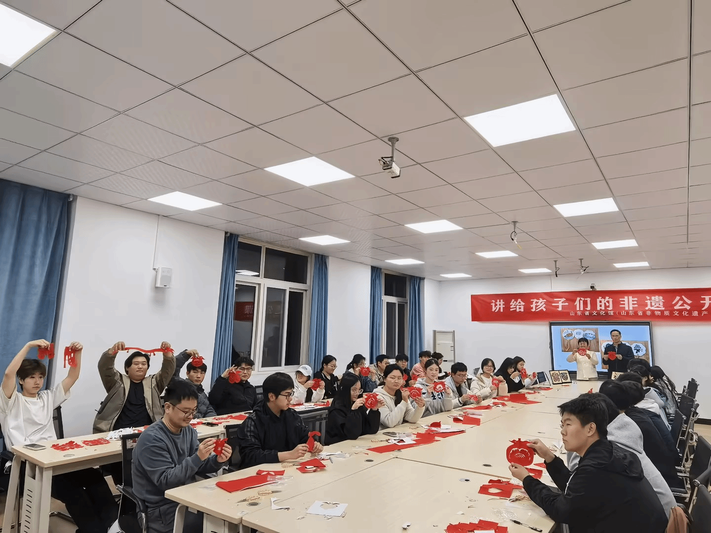 互动教学环节中,衣培娟老师手把手教授学生阳剪、阴剪等传统技法。同学们围坐在一起,从折纸、下剪到展开作品,每一步都充满惊喜。一件件饱含传统美学的剪纸作品在同学们手中诞生,课堂氛围热烈而充满创意。最后,衣培娟老师向同学们发出邀请,欢迎大家走进烟台剪纸传承基地,近距离感受非遗艺术的魅力。