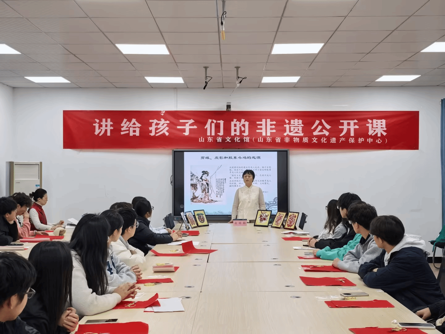 课堂伊始,衣培娟老师以自身的艺术经历为切入点,向师生介绍了多年来在剪纸创作、传承与创新方面取得的成就。作为胶东地区剪纸艺术的重要代表人物,其作品以细腻精巧、古朴灵动著称,深受学界和社会各界认可。