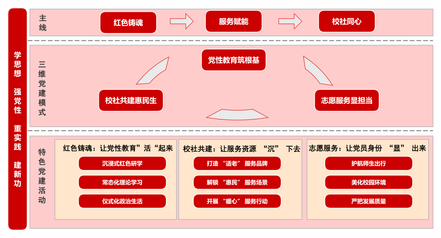 本站讯 机关第二党总支第四党支部始终锚定“学思想、强党性、重实践、建新功”总要求,坚持“红色铸魂、服务赋能、校社同心”为主线,构建“党性教育筑根基、校社共建惠民生、志愿服务显担当”三维党建模式,将组织优势转化为服务效能,让党建工作既有“思想高度”,又有“民生温度”,更有“实践深度”。