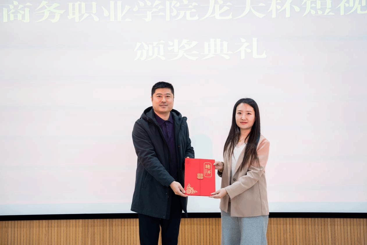 致辞环节结束后,刘晓军为龙大花生油电商部运营武珊珊颁发企业兼职教师聘书。作为本次大赛的企业指导教师,武珊珊对各参赛组提交的作品给予高度评价,并结合龙大花生油的品质优势、品牌故事等核心内容,围绕粮油产品的新媒体传播技巧、短视频内容策划要点等进行了详细总结。“企业专家进校园、实践知识进课堂”培训模式,正是产教融合的具体体现,让学生在创作前就能精准掌握企业产品特性与市场需求,为项目制教学的落地提供了有力支撑。