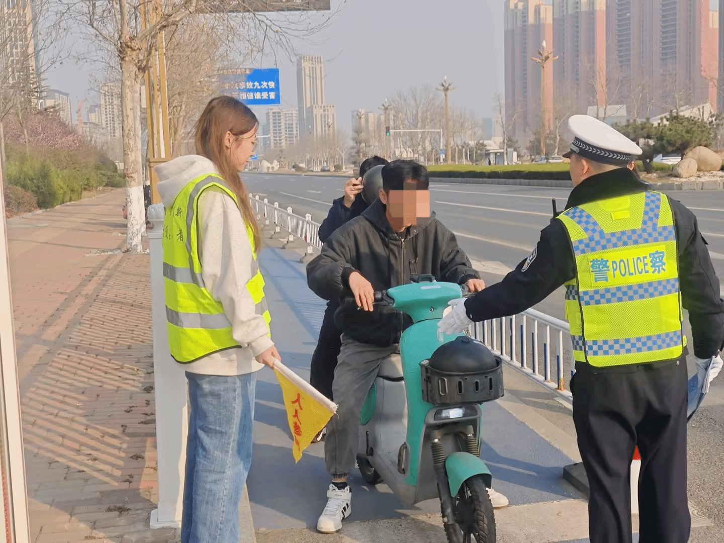 活动现场,身着统一志愿者服装、手持劝导旗的学生们,在交警同志的专业指导和带领下,迅速投入到工作中。他们分工明确,各司其职:一部分同学在路口协助交警维持非机动车和行人通行秩序,对闯红灯、越线停车、不戴头盔等不文明行为进行礼貌劝阻和耐心引导;另一部分同学则利用自身专业特长,向过往市民,特别是老年人与学生群体,直观生动地讲解交通法规和安全出行知识。学生们将课堂所学的艺术表现力转化为有效的公共沟通力,用热情的笑容和真诚的服务,为早春的街头增添了一抹亮丽的“志愿红”与“安全色”。