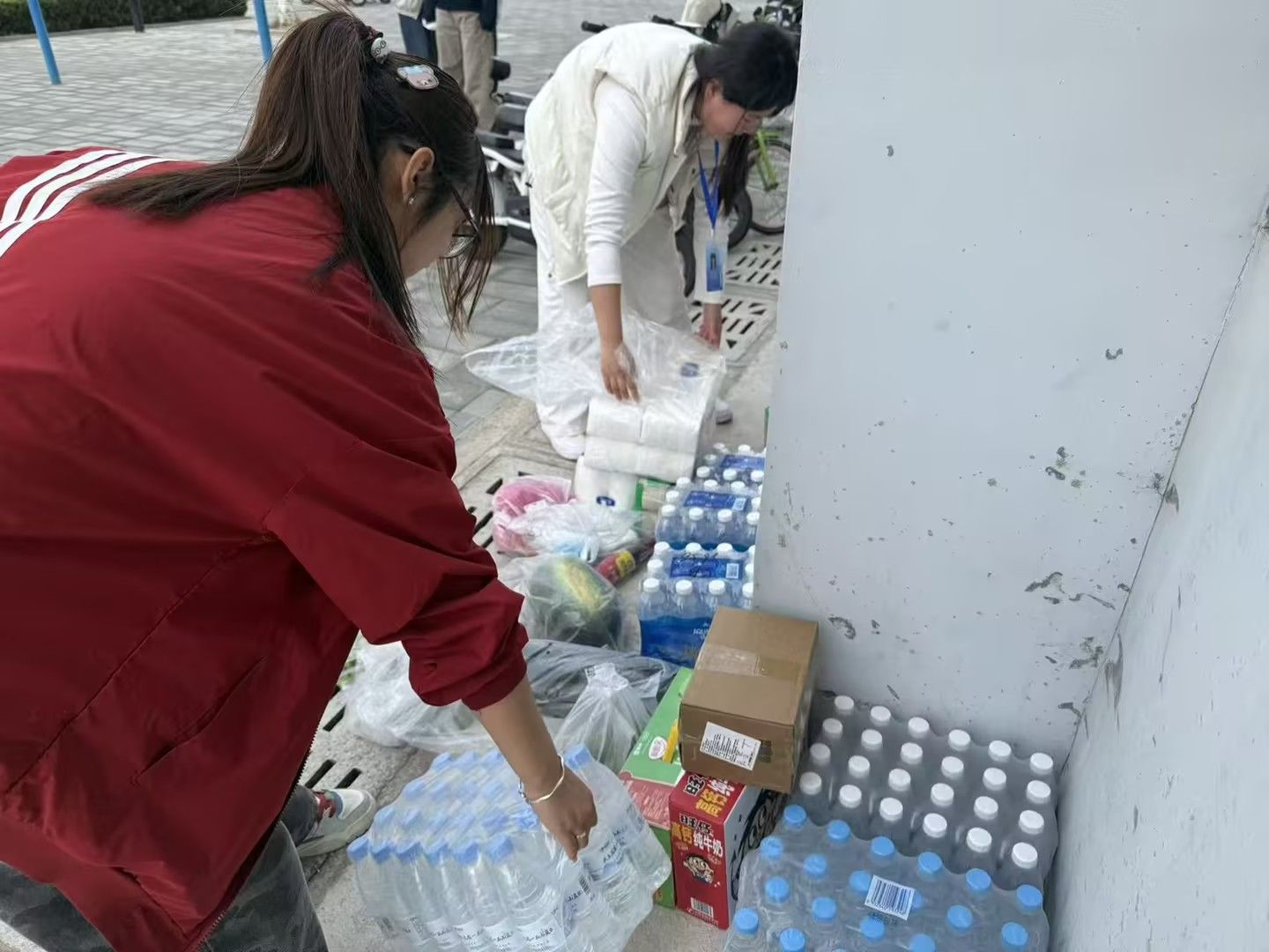 在快递物资整理环节,志愿者们聚焦宿舍楼旁临时堆放点,对散落的矿泉水、纸箱及快递包裹等物资进行分类归置。大家仔细清点、小心搬运,将瓶装水整齐码放,把纸箱叠放收纳,对零散快递逐一梳理并摆放至指定区域,避免物资杂乱堆积影响通行。同时,志愿者们还对周边地面进行清扫,捡拾烟头、包装袋等垃圾,让宿舍楼周边环境焕然一新,为同学们营造了干净、舒适的生活氛围。