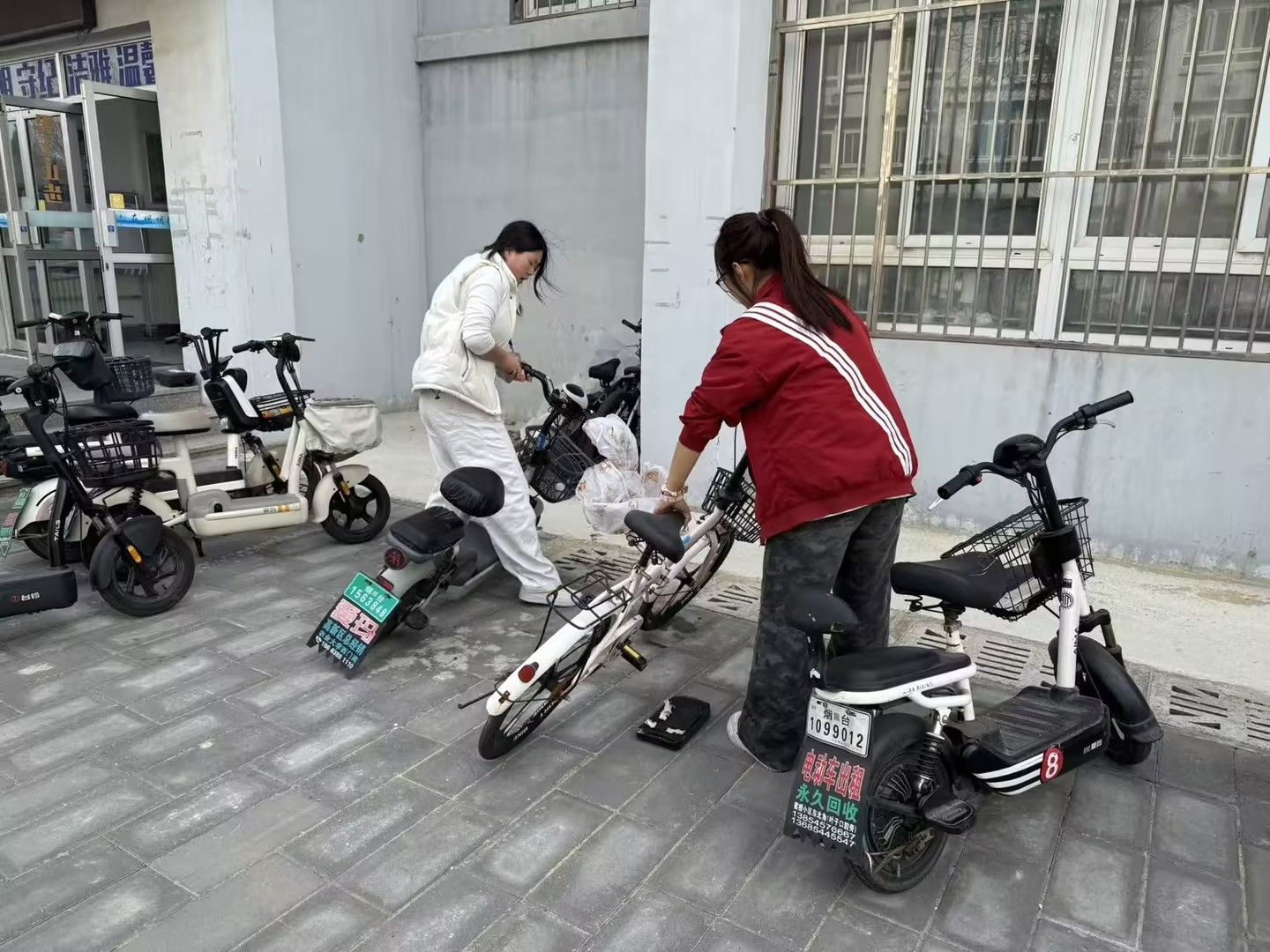 志愿者们以车辆规整为核心任务,对宿舍楼周边的电动车、自行车及共享单车进行全面梳理。面对倒地的车辆,大家合力扶起、仔细扶正,将各类车辆逐一归位至指定停车区域;同时清理车辆夹缝中的纸屑、塑料袋等杂物,彻底解决了车辆乱停、拥堵杂乱、占用通道等问题,切实保障了同学们的出行通畅与安全。