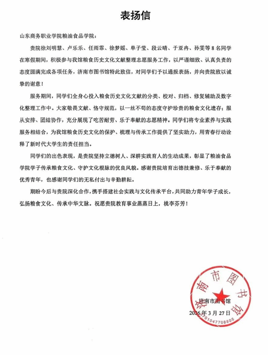 本站讯 近日,粮油食品学院收到济南市图书馆发来的表扬信,对学院“菁粒”志愿服务队徐刘明慧、卢乐乐等8名学子寒假期间投身粮食历史文化文献整理志愿服务的突出表现予以通报表扬,对学院实践育人成果给予高度认可。