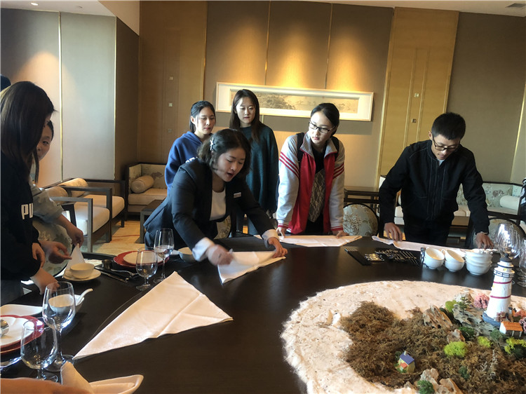 烟台世茂希尔顿酒店是商务外语系的校企合作企业之一。该酒店是芝罘区唯一的国际品牌五星级酒店。参观期间,酒店为新生举办了专题讲座,酒店的人力资源部培训副经理原芳女士为新生详细介绍了希尔顿酒店的发展史、酒店员工的福利待遇以及培养模式和职业发展规划。随后,在酒店相关负责人的带领下,学生们分别参观了酒店大堂、客房、游泳池、健身房等。每到一处,均向学生详细讲解所处场所的功能、服务规范。在参观酒店中餐厅时,酒店经理亲自为新生们演示了餐具及口布的摆放和折叠方法。