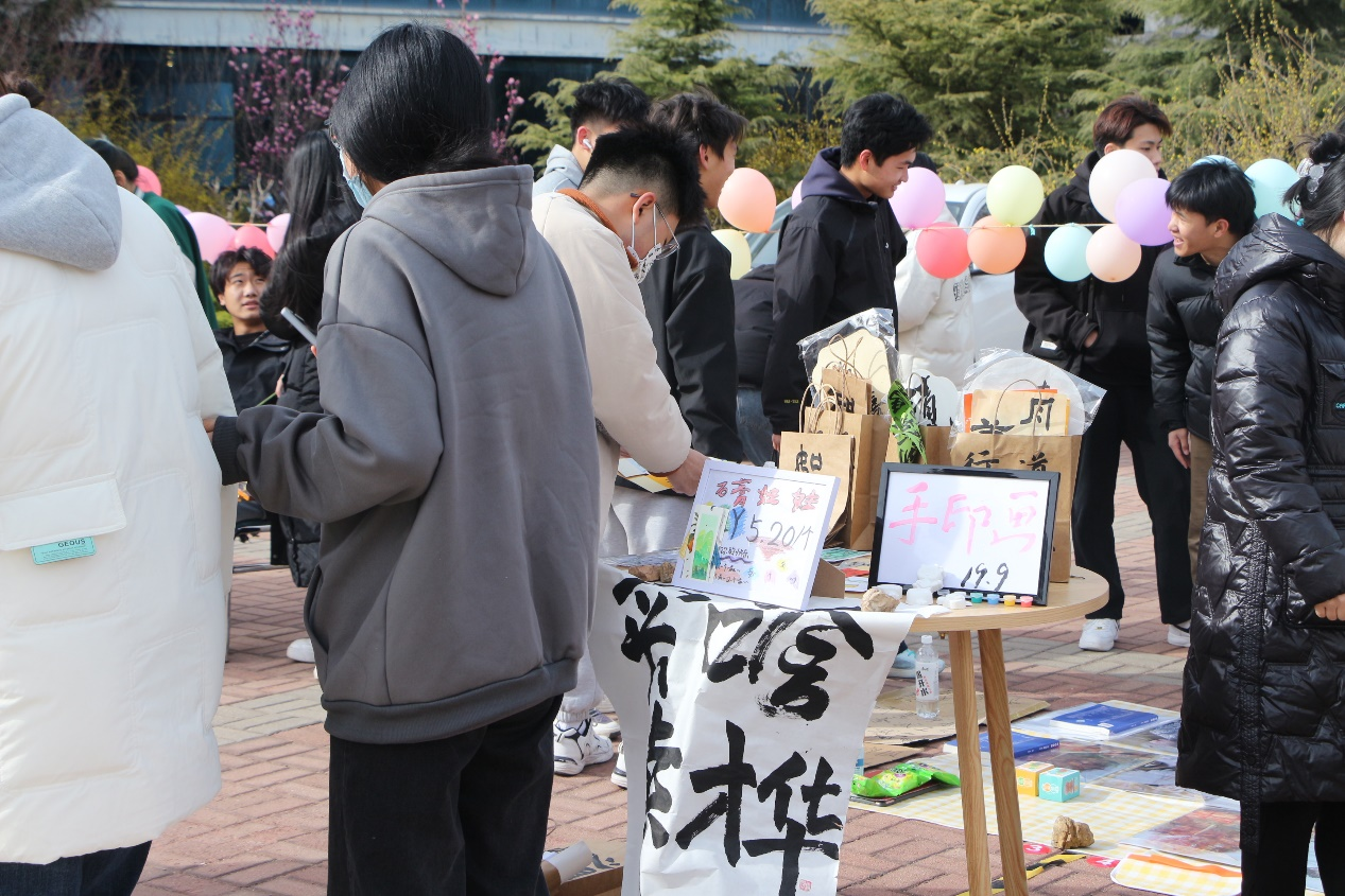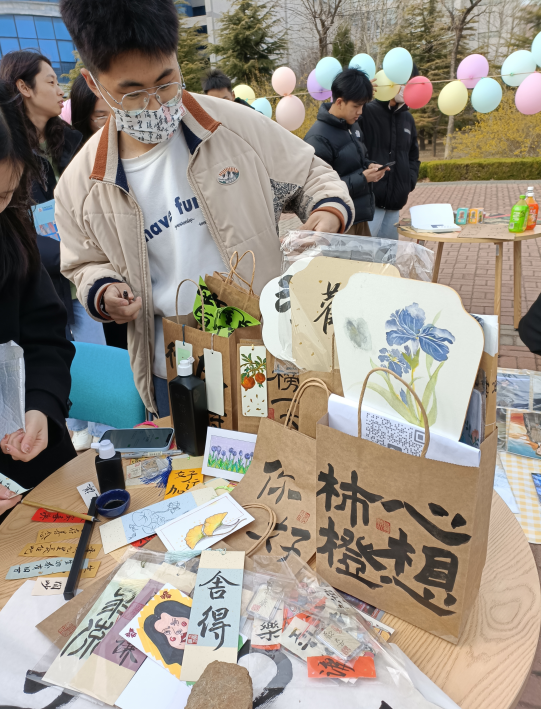 本次活动在现代商务创新示范基地小广场规划区域内有序进行,展销品从书籍、杂志到鞋子、衣服,从绿植、文玩到绘画、书法作品,品类繁多。在众多“经营者”之中,一位手持墨宝,挥洒文笔的同学吸引了大家的注意力,书法社社长、21级连锁专业的同学王一迪现场为大家手绘书法手工艺品,受到学生们的围观和青睐。他表示,参加这次活动,既锻炼了创业实践能力,又能弘扬中华传统书法文化的魅力。