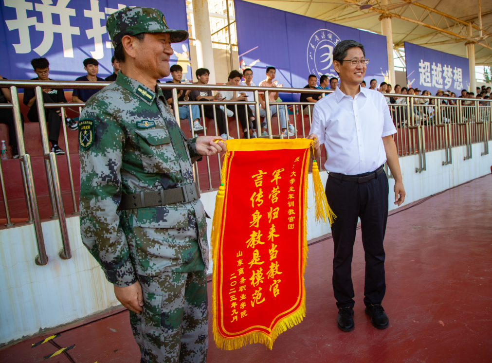 本站讯 金秋九月,秋风送爽,丹桂飘香,9月22日下午,2023级新生军训结业典礼在学校田径场举行。学校党委书记孙云茂,党委副书记、校长王发明,莱山区人民武装部军事科科长王磊,副校长陶传蔚,副校长张云生出席典礼。学校二级学院党政领导、辅导员老师、各有关处室干部职工、军训团各营长、各连长、2023级全体新生和老生代表参加典礼。典礼由副校长陶传蔚主持。