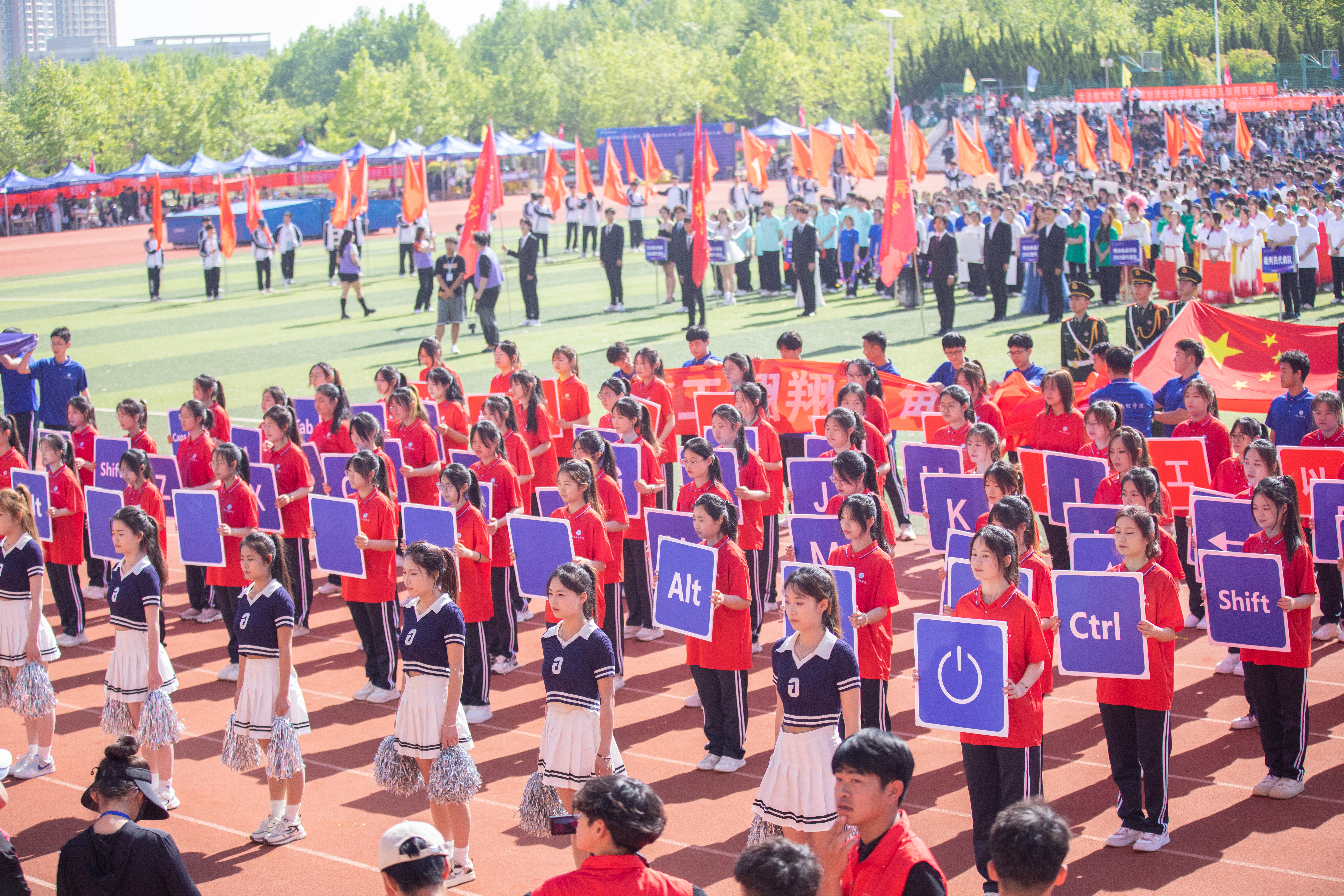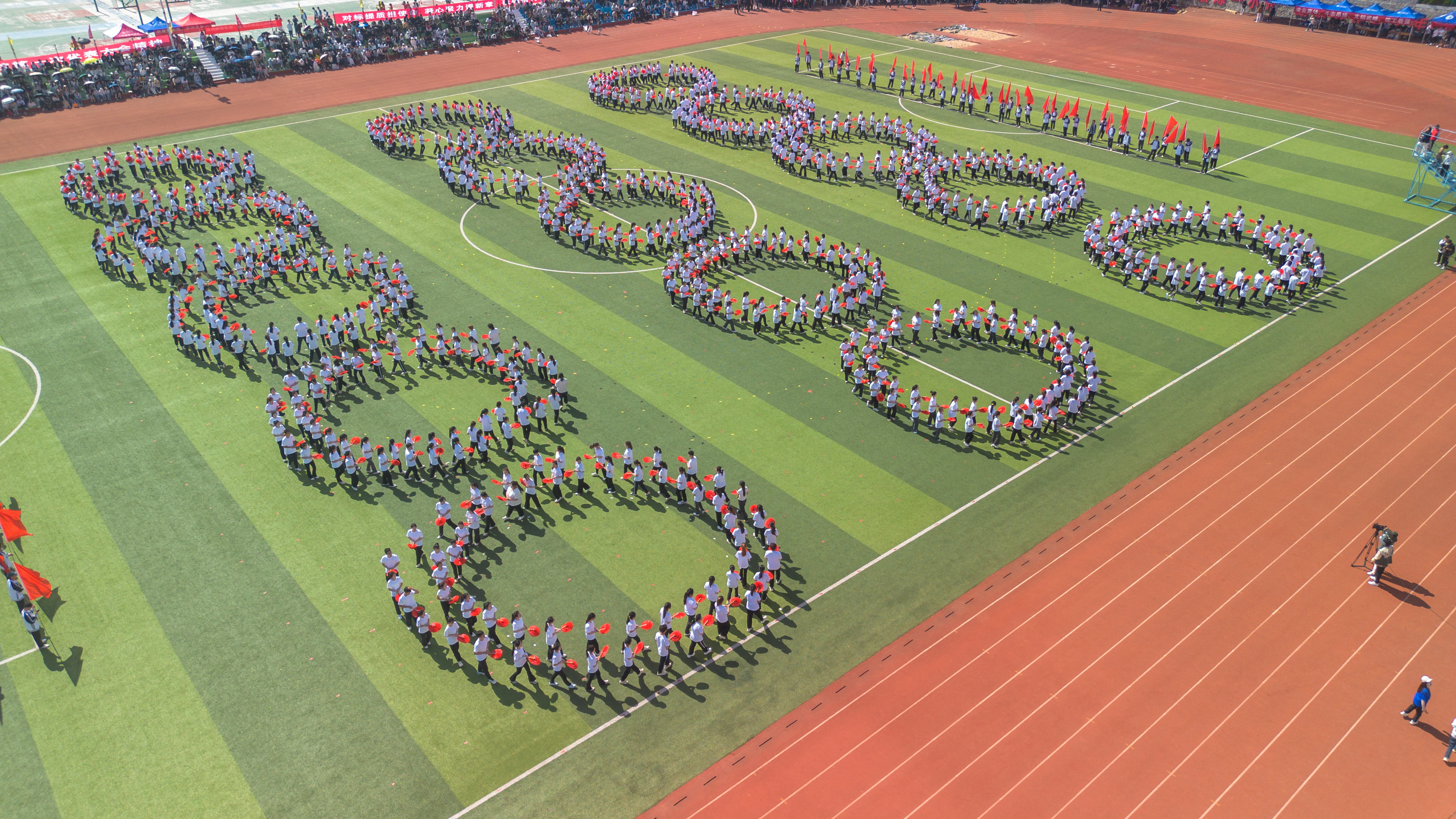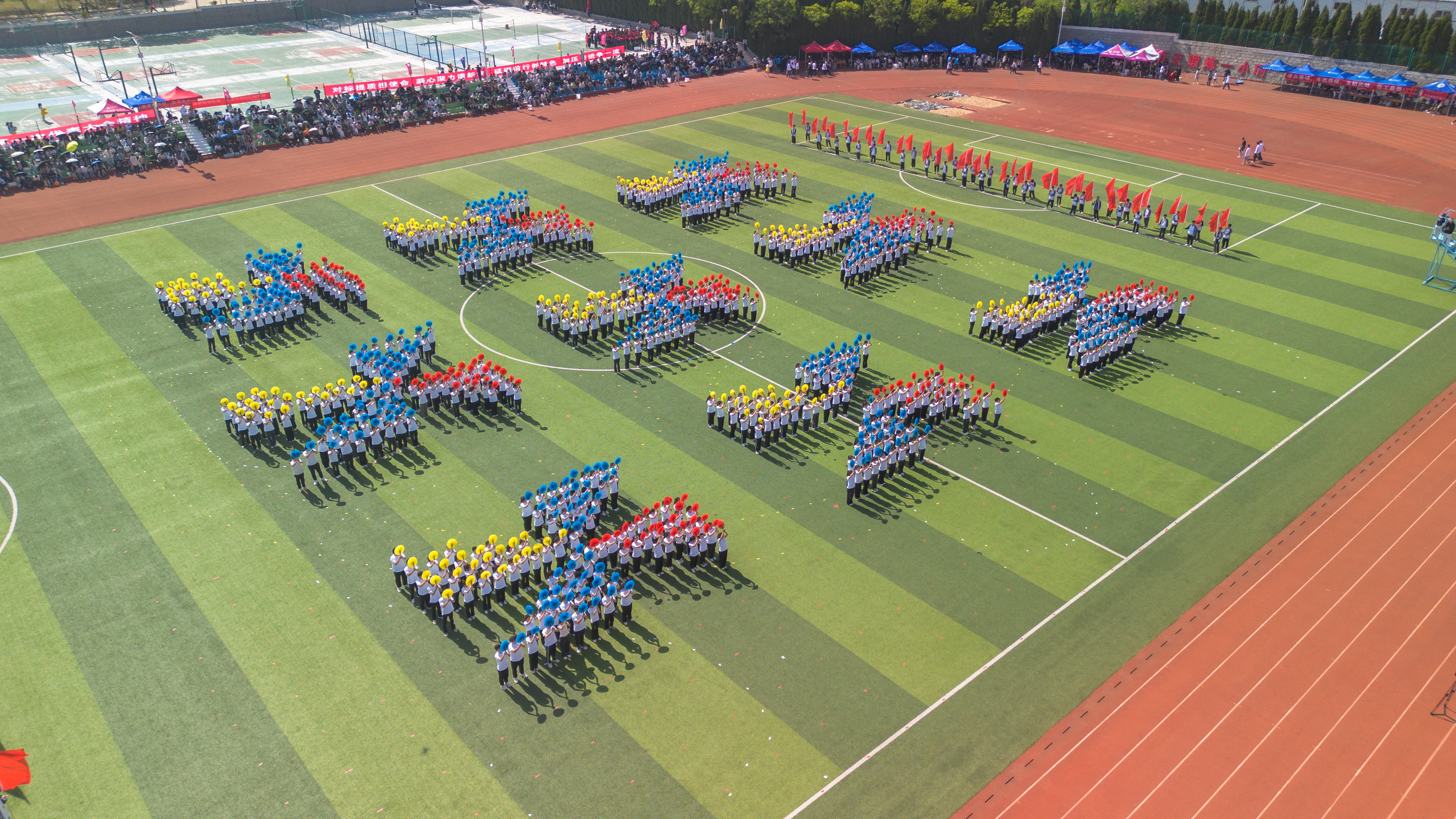 伴随着激情如火的音乐,由900人组成的团体操方阵,旭日—在商务升起!同学们灿烂的笑脸上,凝注着“更积极,更和谐,更向上”的体育梦想,彰显着“更高,更快,更强,更团结”的体育精神,同学们不停变换着各种队形,场面恢弘,气势宏大,整齐划一,激情四射,给观众们呈现了一场视觉盛筵。团体操表演很好地呈现了本届运动会的主题“运动激扬青春、拼搏成就梦想”,为学校高质量发展注入了新的活力。最后呈现的圆形图案,代表着我们的祖国人民一家亲,时刻紧密围绕在以习近平同志为核心的党中央周围。学子们变换造型,呈现出一颗光芒璀璨的太阳造型,这象征着我们的祖国、我们的学校向阳而生,逐光而行!