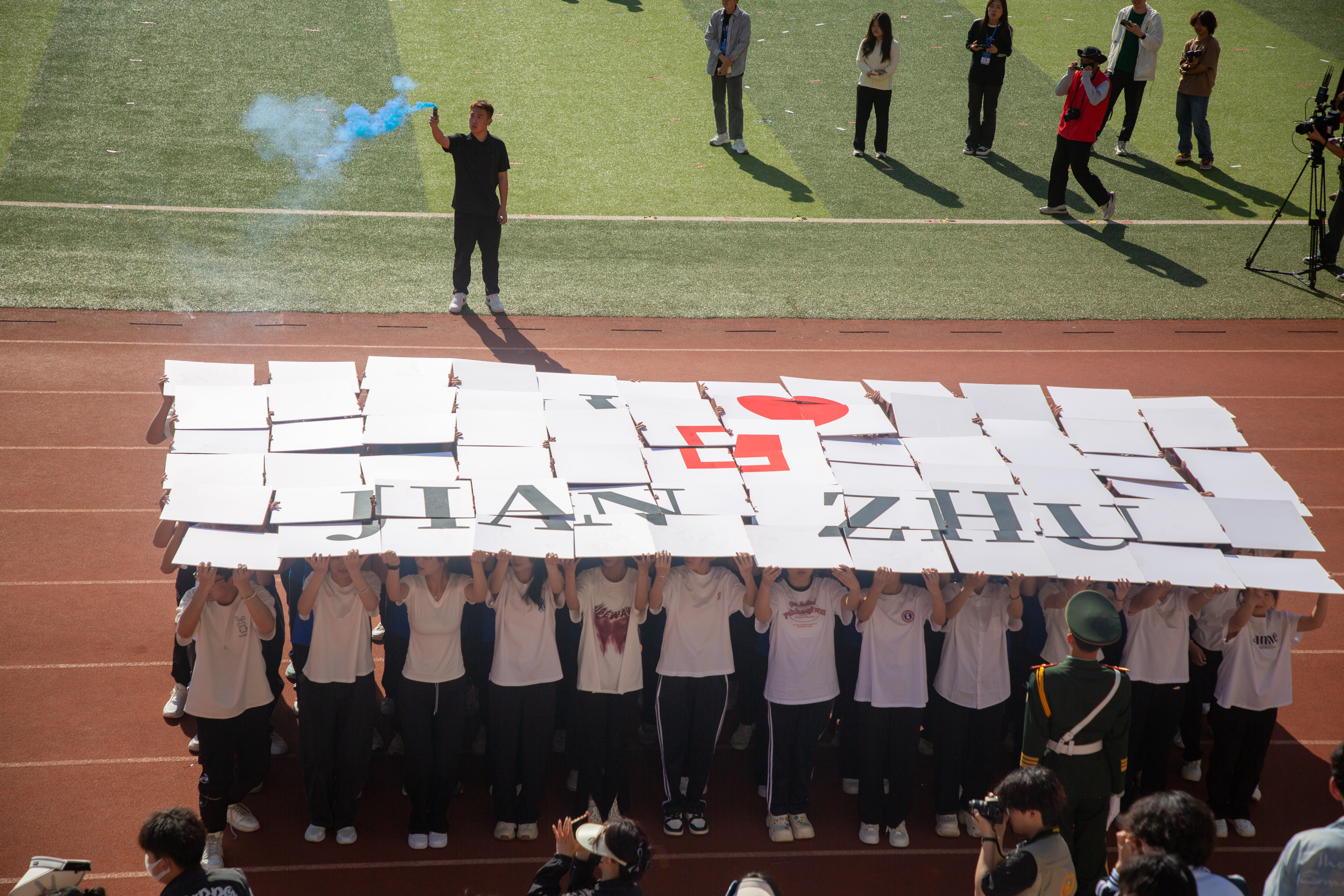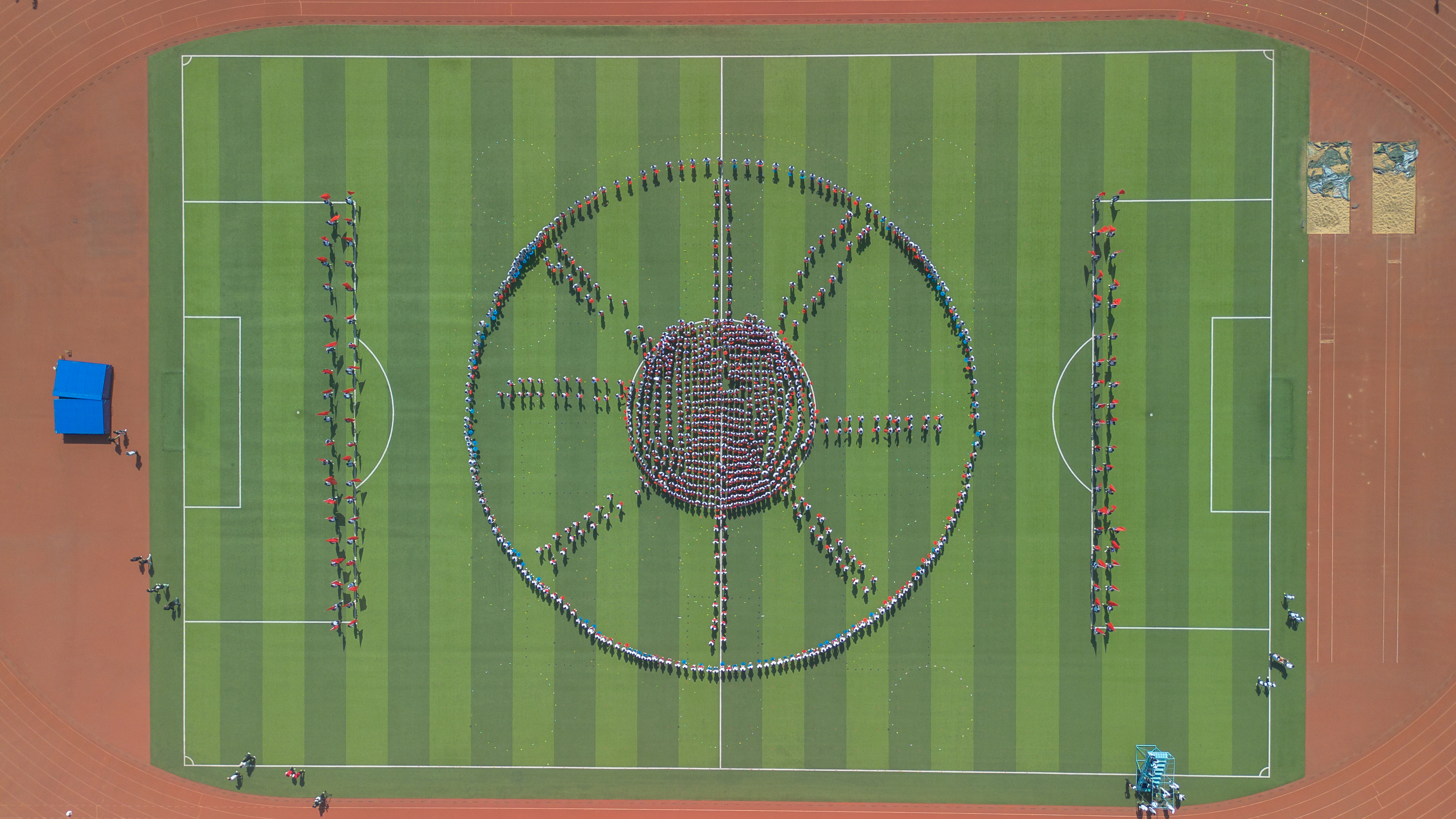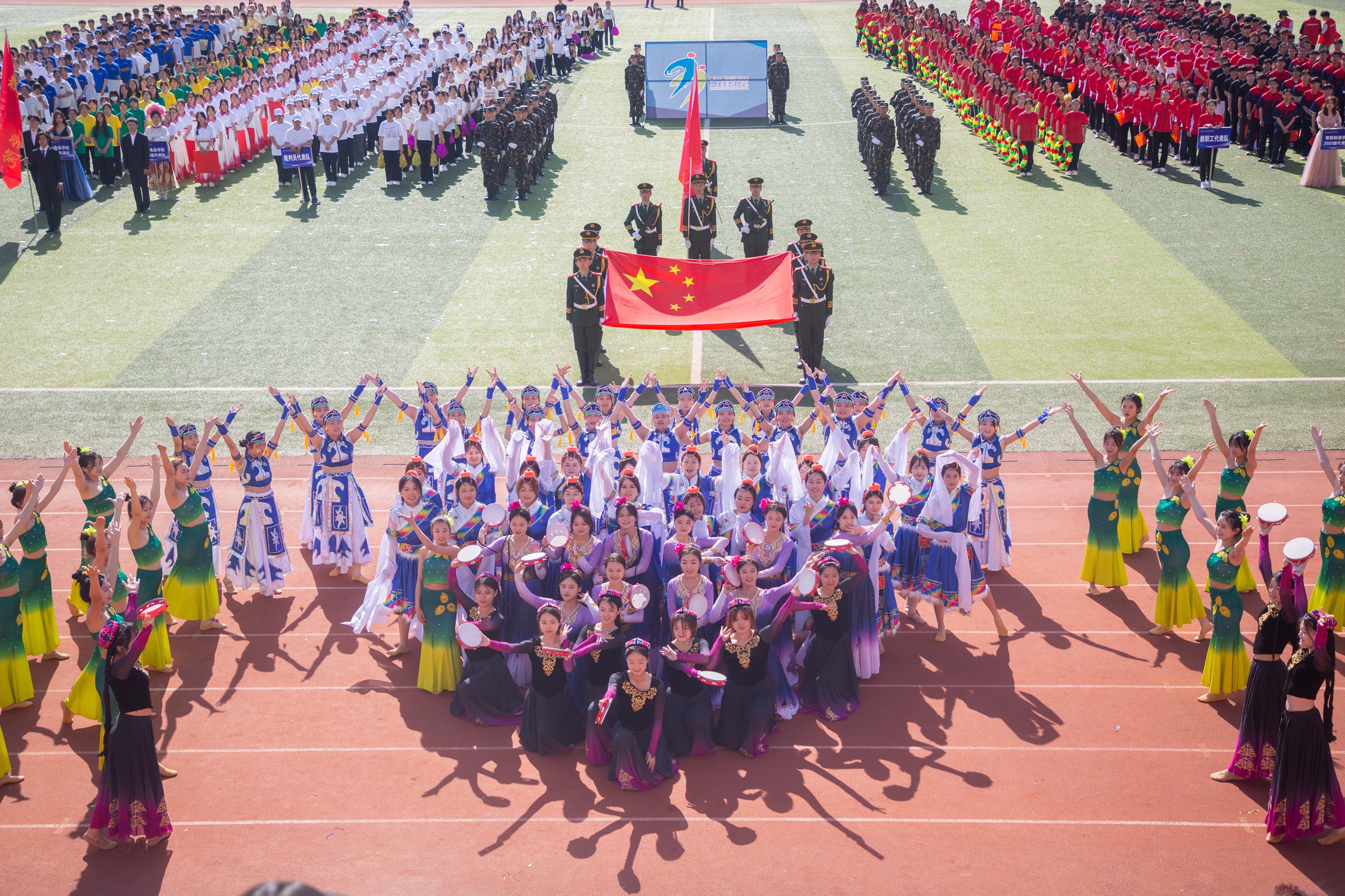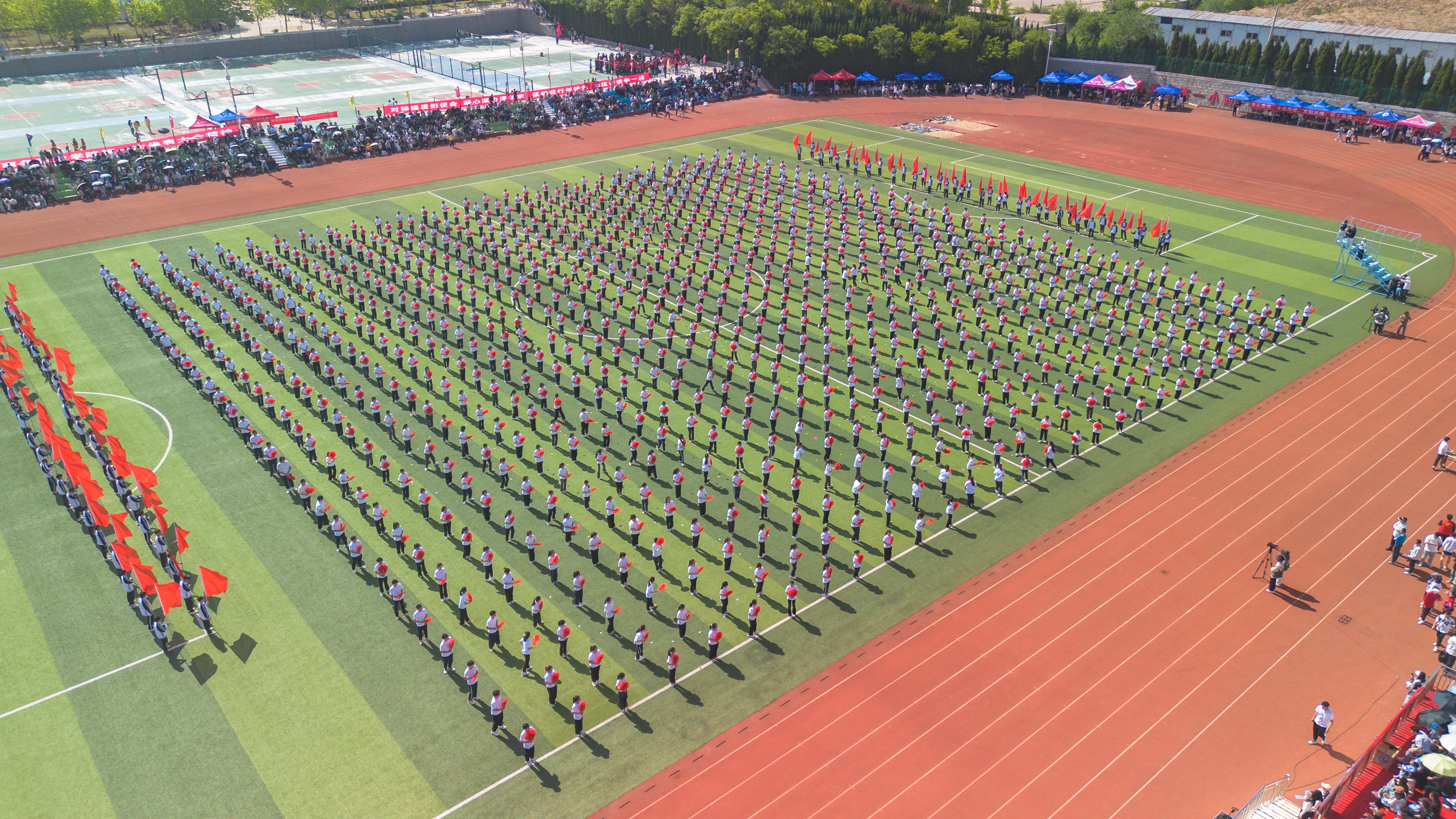 伴随着激情如火的音乐,由900人组成的团体操方阵,旭日—在商务升起!同学们灿烂的笑脸上,凝注着“更积极,更和谐,更向上”的体育梦想,彰显着“更高,更快,更强,更团结”的体育精神,同学们不停变换着各种队形,场面恢弘,气势宏大,整齐划一,激情四射,给观众们呈现了一场视觉盛筵。团体操表演很好地呈现了本届运动会的主题“运动激扬青春、拼搏成就梦想”,为学校高质量发展注入了新的活力。最后呈现的圆形图案,代表着我们的祖国人民一家亲,时刻紧密围绕在以习近平同志为核心的党中央周围。学子们变换造型,呈现出一颗光芒璀璨的太阳造型,这象征着我们的祖国、我们的学校向阳而生,逐光而行!