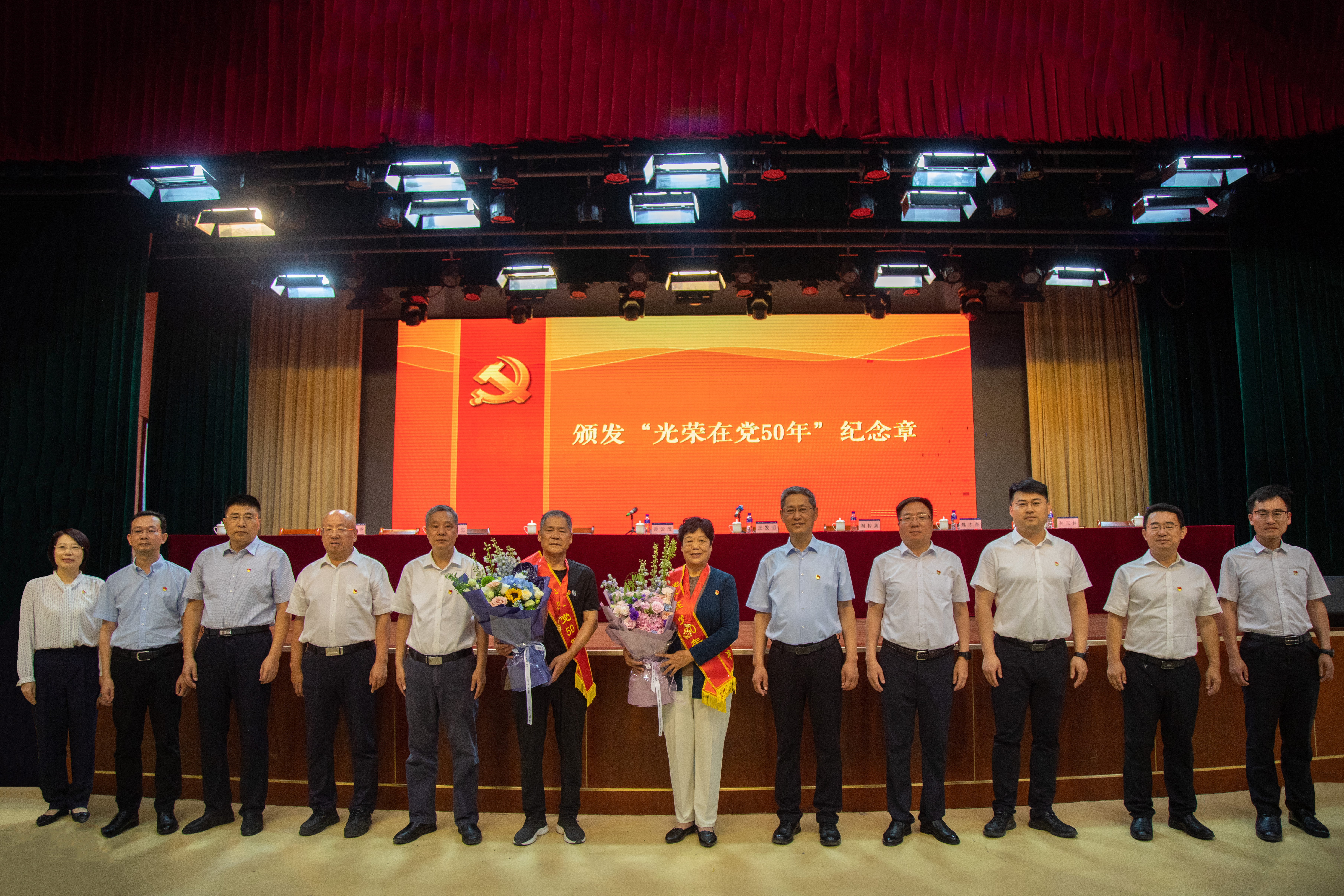 会上,学校领导为党龄达到50周年的老党员颁发“光荣在党50年”纪念章。