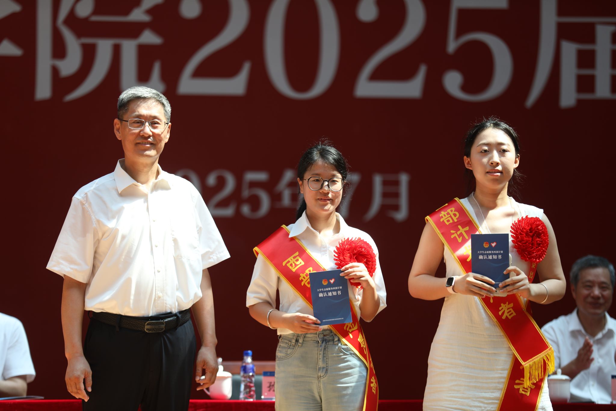 毕业典礼上,学校党委书记孙云茂向西部计划志愿者颁发录取通知书。