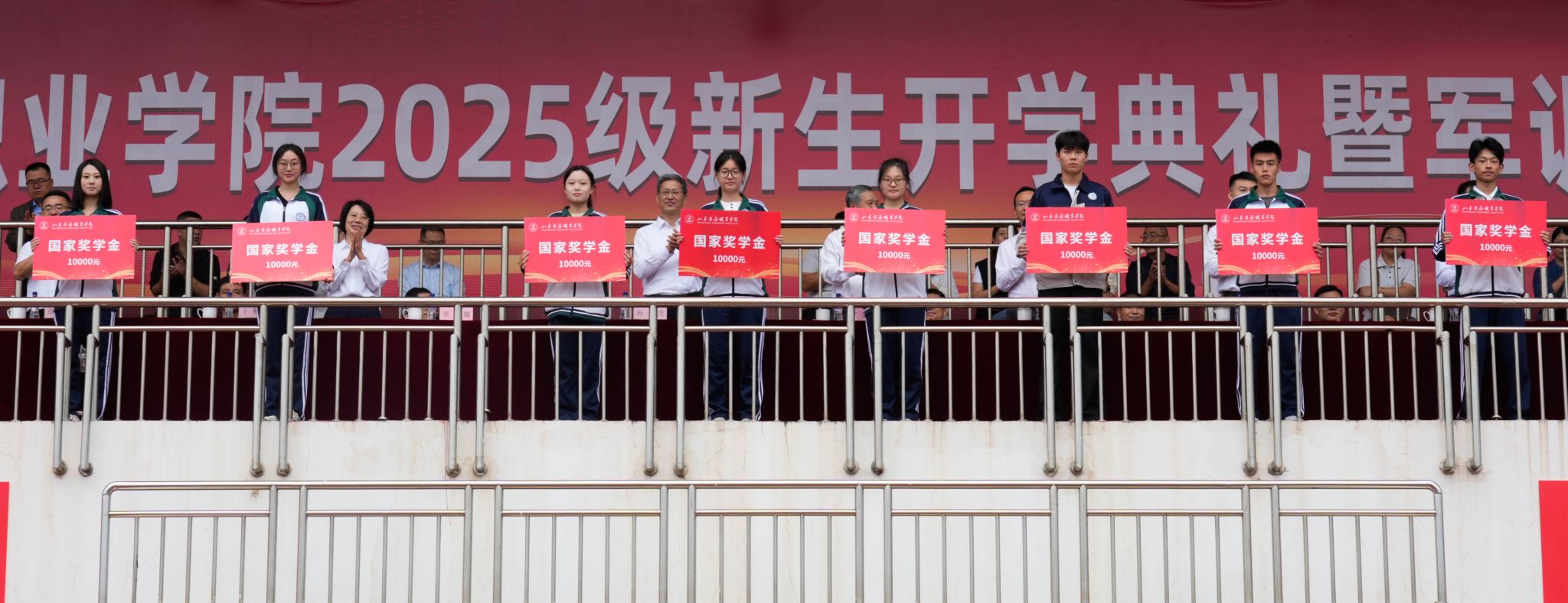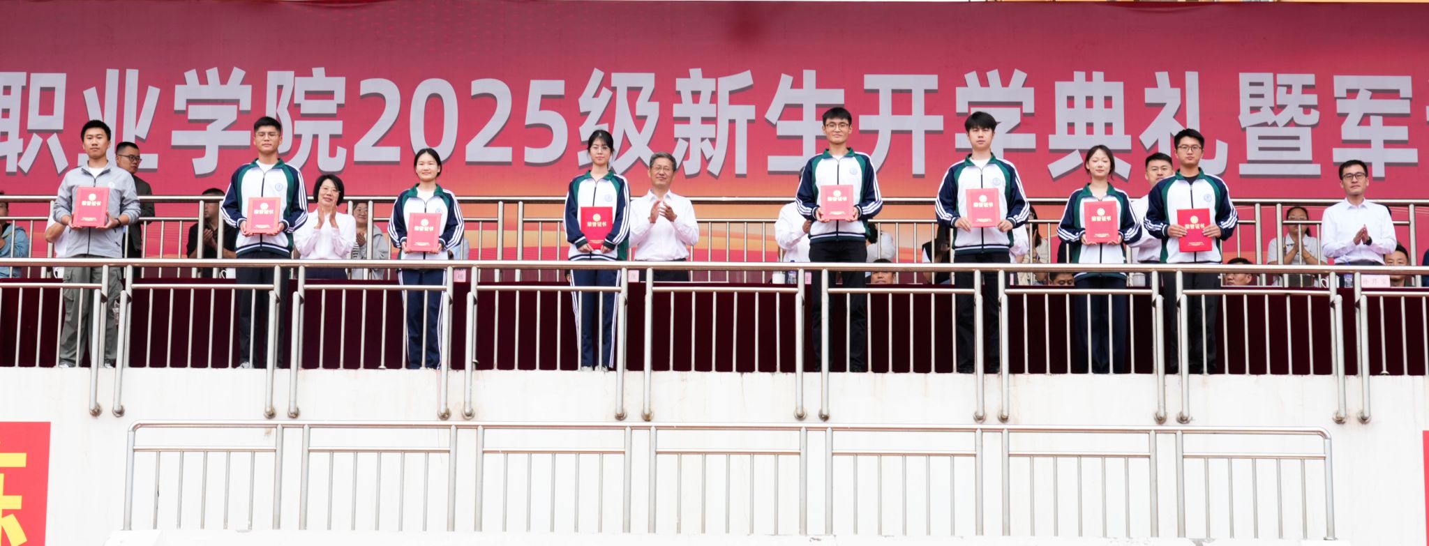 学校领导为2025年世界职业院校技能大赛国赛获奖学生代表,2024—2025学年国家奖学金获得者颁发荣誉证书。教官为2025级军训团优秀学员代表颁奖。