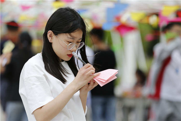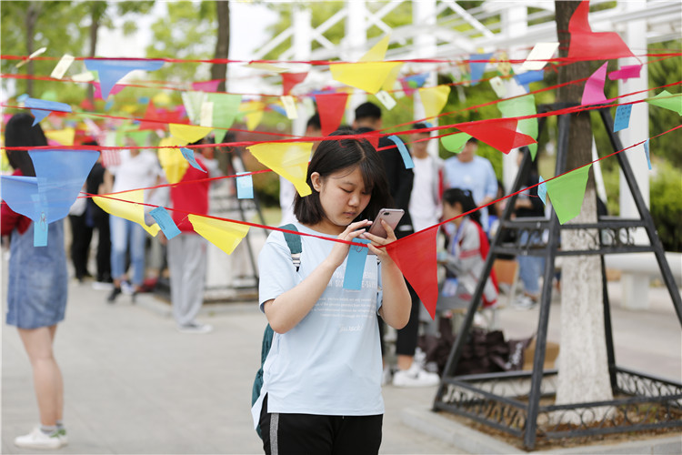 为了这次活动,图书馆老师们提前一个月就开始策划筹备,并提前一天将100条彩旗悬挂在中心大道,早早营造起节日氛围。活动当天上午,图书馆将精选的1000道谜语和古诗题悬挂在彩旗上,过程中引来了下课路过这里的同学们围观,活动尚未开始便迎来一小波火爆场面。下午两点左右,活动正式开始,图书馆老师们、饮食中心的师傅们、图书馆学管会的同学们,按照事先安排好的工作岗位,各就各位,忙的不亦乐乎。同学们也陆陆续续从四面八方走进活动场地,咨询活动规则,领答题卡,认真答题。活动规定答对10道、20道、40道题目可获得相应的奖品,活动题目涵盖了我们耳熟能详的古诗词名句和简单易猜的谜语,同样也有许多生僻的古诗和难度较大的谜语,想要答对几十道题也并非易事。只见同学们有的“单独作战”,有的“结伴而行”,有的“三五成群”,或靠“最强大脑”,或靠“集体智慧”,都答对了几十道题拿到了自己中意的奖品。奖品有读书节纪念品,也有端午五彩绳、小香囊,还有多肉植物。同学们非常喜欢这些奖品,尤其是五彩绳和小香囊,领到后迫不及待地戴上手腕,“彩线轻缠红玉臂,小符斜挂绿云鬟”,浓浓的端午节日的喜悦气氛就这样萦绕在同学们的身边和心间。