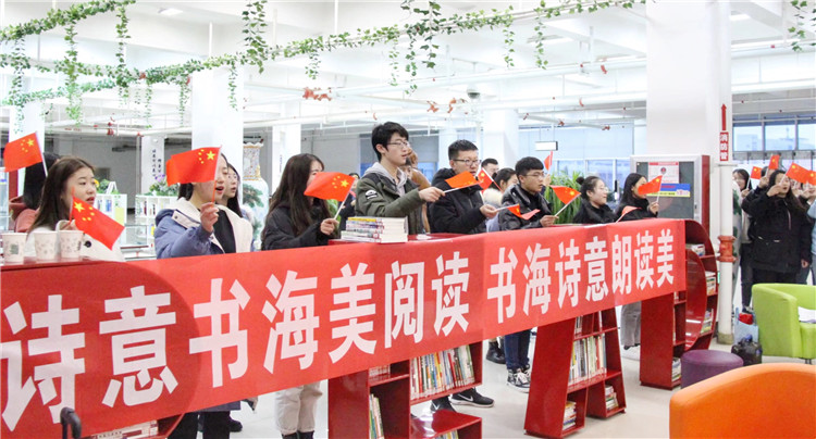 本站讯 12月17日下午,图书馆里200余名大学生挥舞着五星红旗,为祖国喝彩,为澳门庆生,共享中华民族伟大复兴的荣光!诗意书海美阅读,书海诗意朗读美!在喜迎澳门回归祖国20周年之际,山东商务职业学院图书馆里一片诗意的红色海洋!在图书馆二楼大厅的朗读亭前,全国首届节目主持人“金话筒”奖获得者、烟台市妇联“巾帼红诵“志愿者、山东商务职业学院校外人生导师刘丽老师用心灵朗读、用真情朗读,深情朗读多篇充满诗意的优秀诗歌作品,与大学生共享美好的阅读和朗读时光,共同为祖国歌唱,为中华民族讴歌,为新时代的中国朗读!