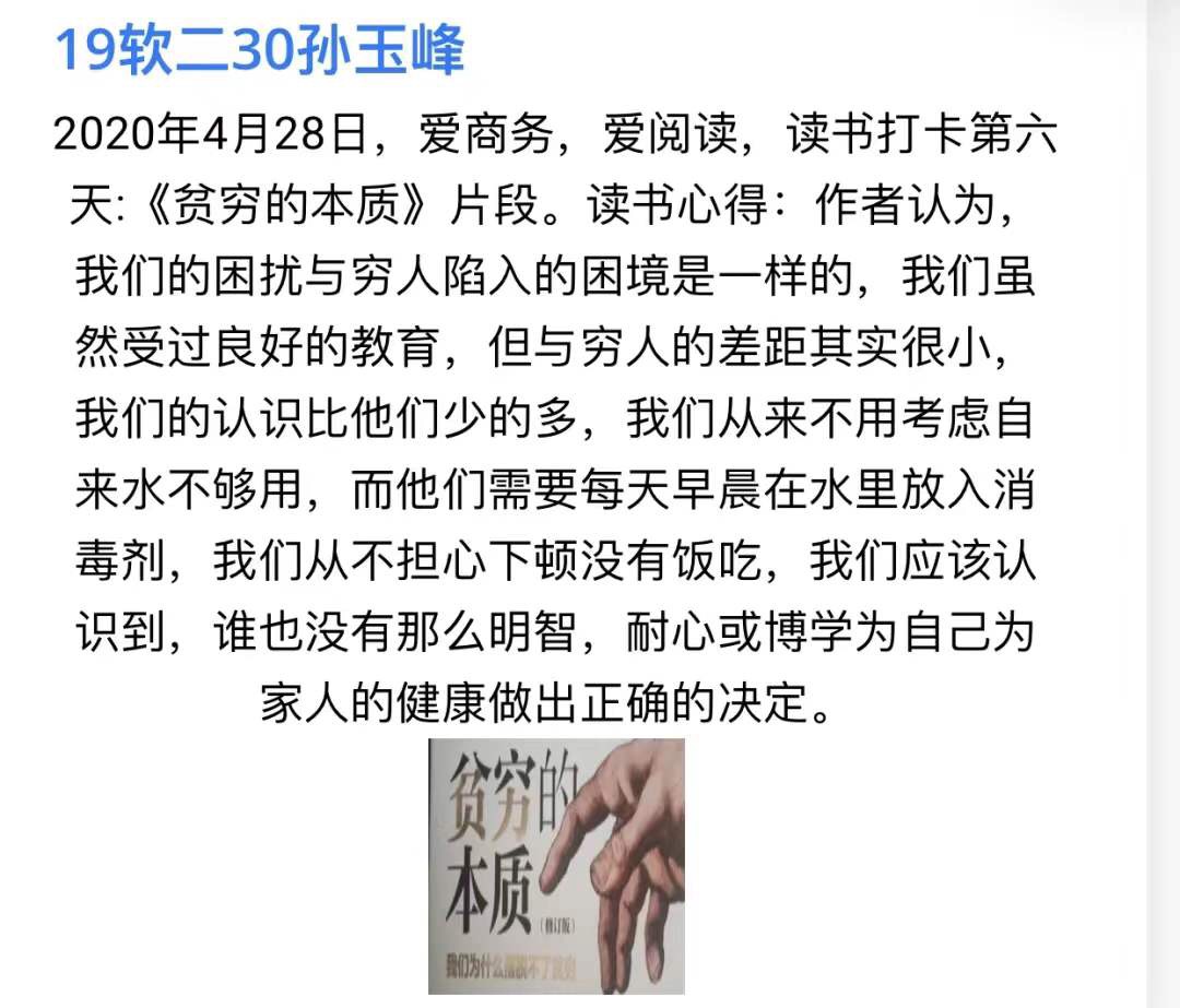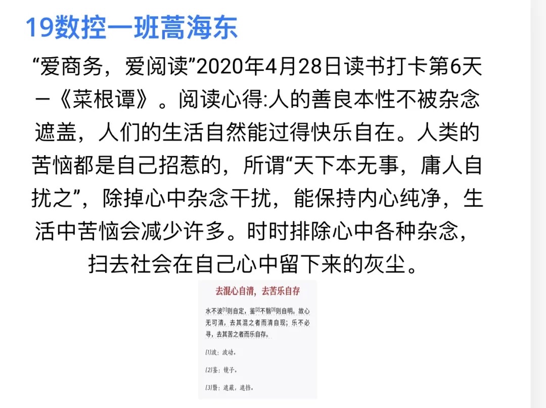 由于受到新冠肺炎疫情的影响,今年的读书节活动也比较特殊,全部采用线上方式进行,于4月23日启动,6月11日结束。读书节的活动也是特殊时期特别设计,首先突出”静”的特点,如阅读马拉松挑战赛需要参与者连续21天不间断阅读打卡,这就需要参与者一定要摒弃浮躁,静下心来阅读;诗歌创作大赛,书画大赛,观书有感等活动,无一不需要参与者静下心来创作,才能创作出优秀的有内涵的作品。通过参与者提交的阅读心得和疫情期间的感悟,我们不难看出参与者因静心阅读和创作而带来的内心治愈性的抚慰。其次,读者节活动还突出了“疫”的特点,如本届读书节主题为'’书’途同归,’疫’往无前”,是希望疫情早日过去,学子们早日回归校园;各项活动也都着重强调要歌颂抗疫英雄,结合新冠肺炎疫情发表感想,以此来激发大学生的爱国热情,增强抗疫胜利的信心以及责任感。活动中,同学们不仅参与热情高涨,作品亦是精彩纷呈。“战疫”系列绘画让人叹为观止,19电气一班刘昌燕创作的古体词,以及19软件二班的李娜等多位同学创作的战疫主题诗篇,展现出了深厚的文学创作功底。