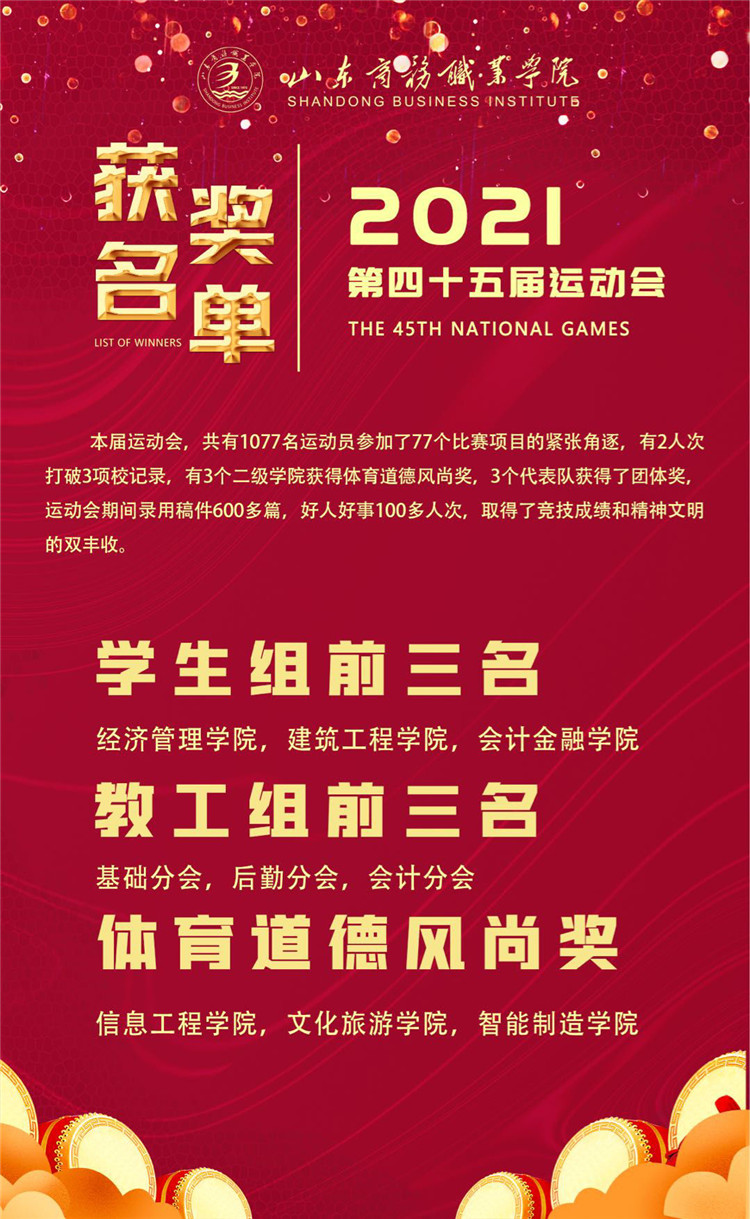 本届运动会安排周密,运动员发扬了顽强拼搏的精神,尊重裁判、尊重对手,赛出了水平和风格;裁判人员严守竞赛规程,公正裁决;工作人员恪尽职守,热情服务。经过两天紧张激烈的角逐,智能制造学院刘真真打破我校女子100米和200米纪录,李树茂打破男子3000米纪录;经济管理学院、建筑工程学院、会计金融学院分获学生团体总分前三名;基础分会、后勤分会、会计分会分获教职工团体总分前三名;文化旅游学院、信息工程学院、智能制造学院获得体育道德风尚奖,运动会期间录用稿件600多篇,好人好事100多人次,取得了竞技成绩和精神文明的双丰收。