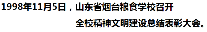 1998年10月5日,根据《山东省文明单位建设管理条例(修订稿)》,在对1997年度省级文明单位进行了充分审核和认真复查后,山东省精神文明建设委员会决定对符合条例条件的163个单位授予1997年度“省级文明单位”称号。山东省烟台粮食学校荣耀登榜。