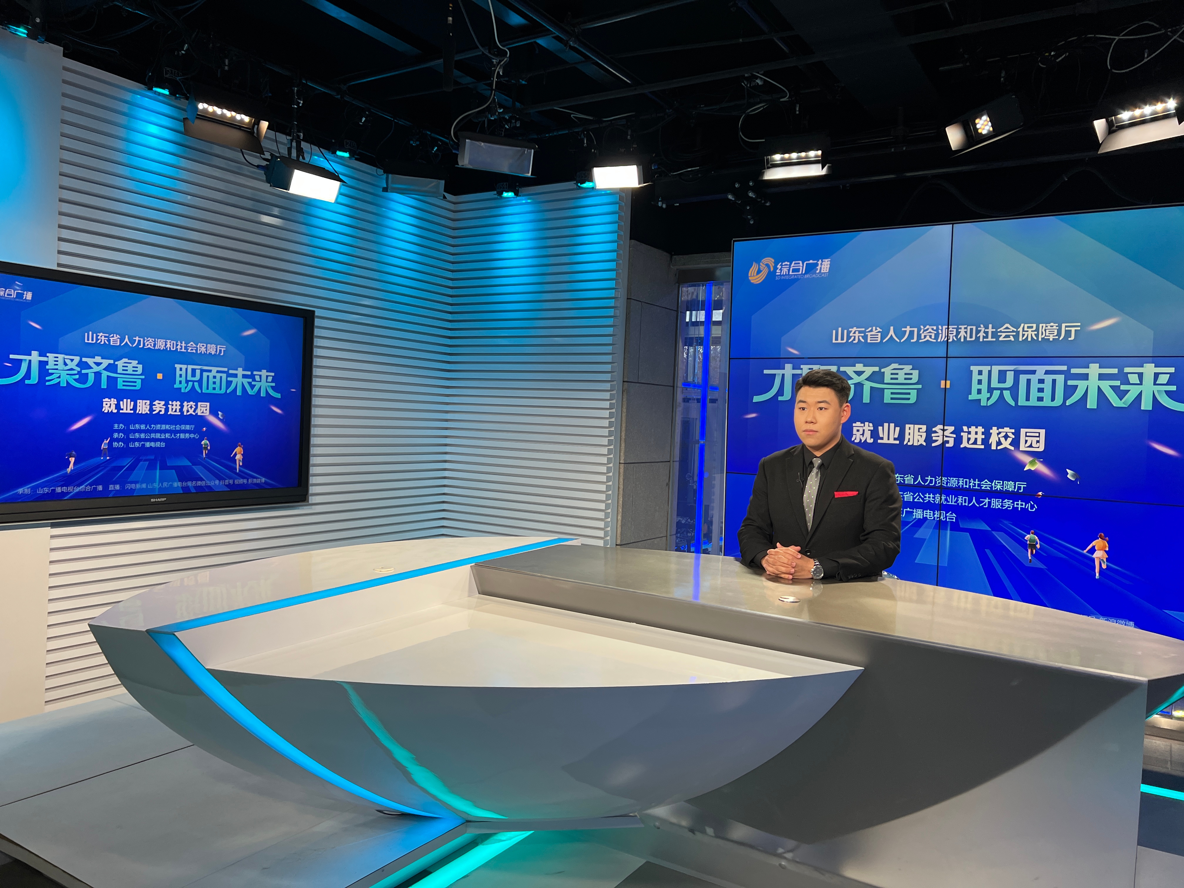 本站讯 近日,由山东省人力资源和社会保障厅联合山东广播电视台,面向全省高校共同拍摄制作的2024年“才聚齐鲁·职面未来”公益就业指导直播课已成功上线。我校文化旅游学院2024届毕业生,首届全国大学生职业规划大赛总决赛就业赛道职教组金奖获得者隋松昊(山东省唯一的高职学生代表),以“愿为迎客松 巍峨壮清昊 一名高职毕业生高质量就业的心路历程”为主题,参加了本次专题节目的录制。