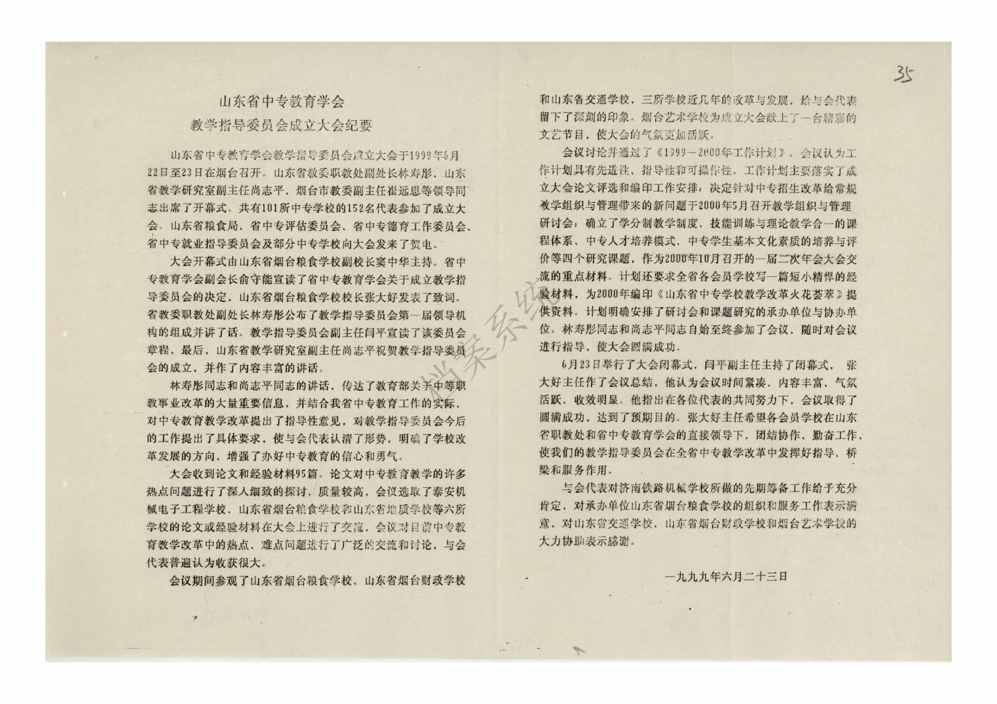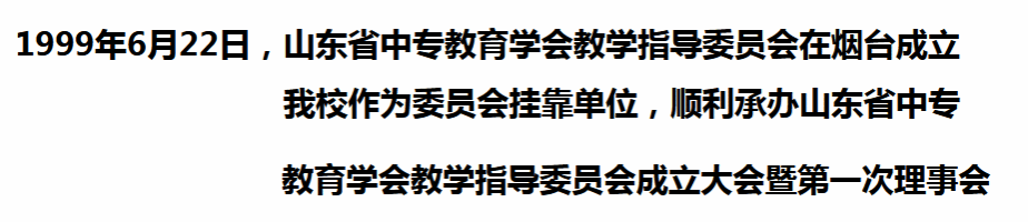 1999年6月22日,山东省中专教育学会教学指导委员会在烟台成立。我校作为委员会挂靠单位,顺利承办山东省中专教育学会教学指导委员会成立大会暨第一次理事会。