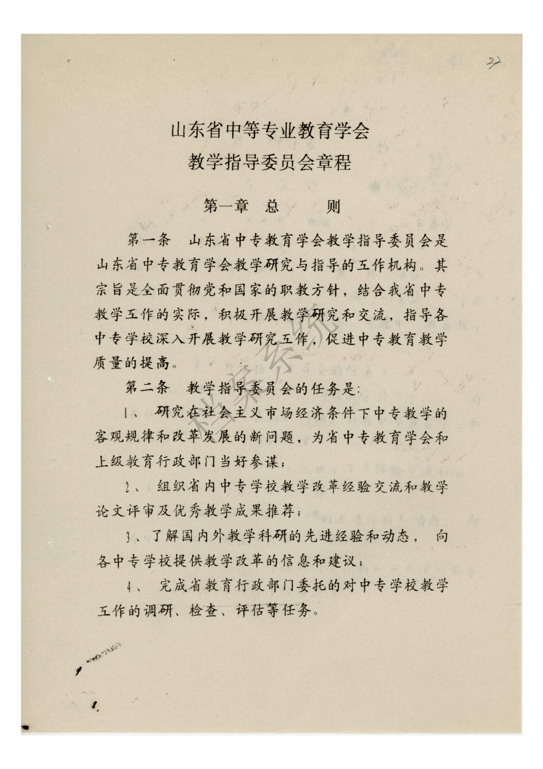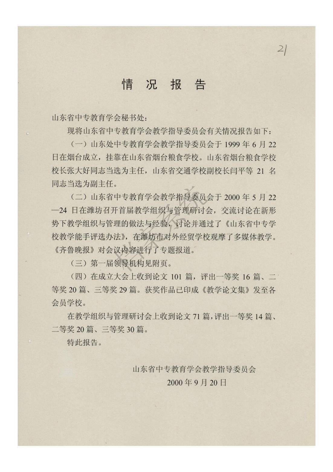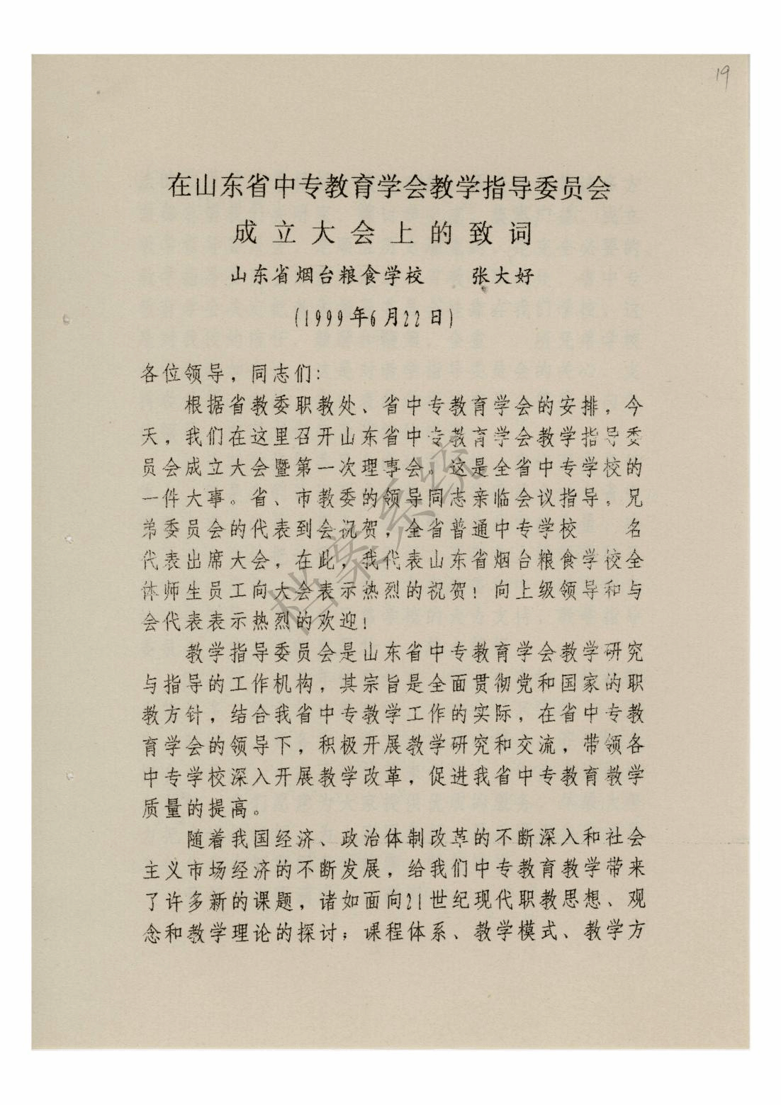 20世纪90年代,伴随着社会主义市场经济的快速发展,中专教育踏入了教育教学体制改革的浪潮。为顺应历史潮流,应对21世纪可能出现的各类机遇和挑战,山东省教委职教处、山东省中专教育学会经研究决定成立山东省中专教育学会教学指导委员会,并将委员会挂靠在山东省烟台粮食学校。