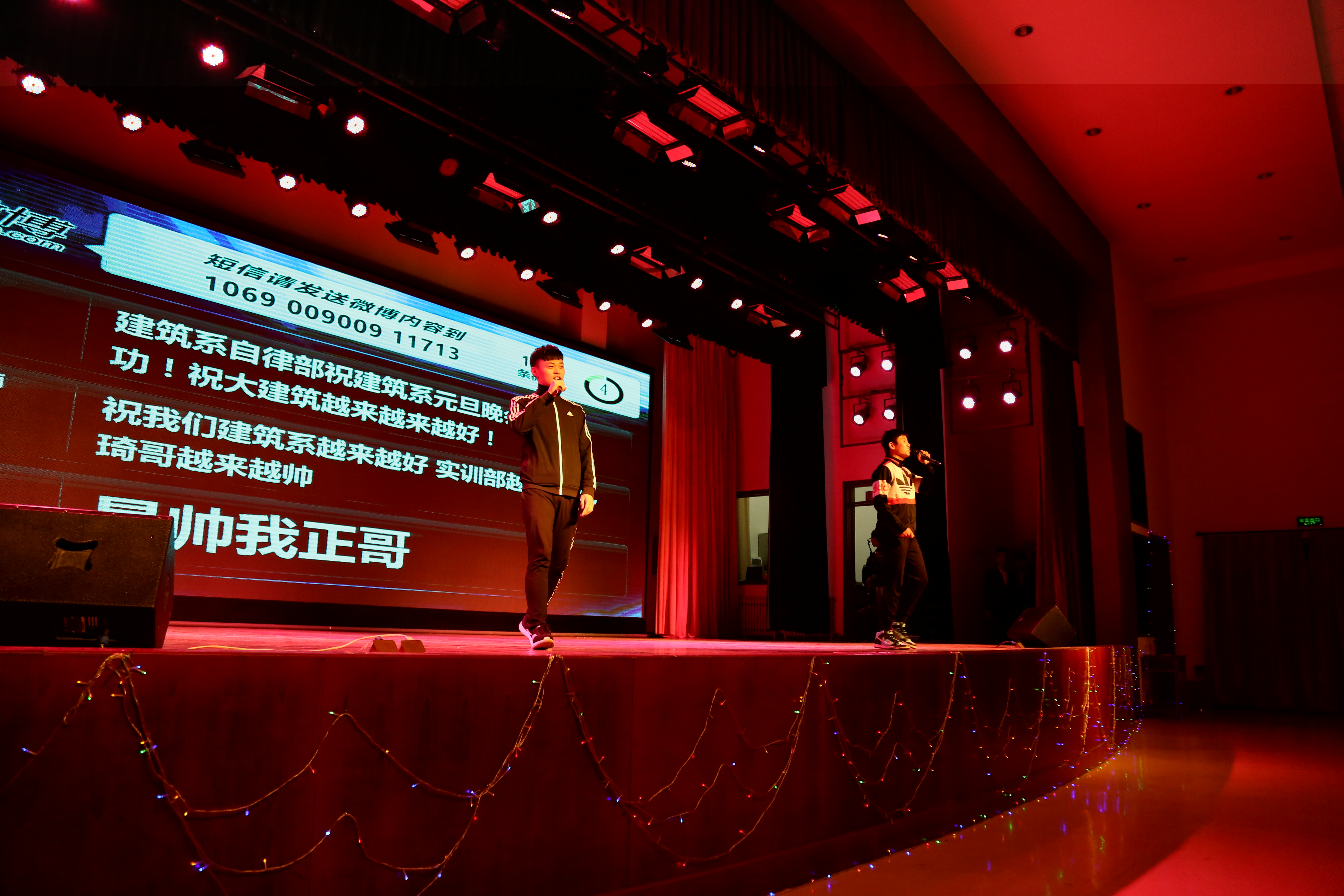 伴随着倒计时,彩花的飞舞,节目正式开始,文艺部与各部部长带来的一首《新年大吉》,瞬间将现场带入了节日的气氛,随后带来的热舞表演也掀起了一阵小高潮。朗诵节目《中国梦青春梦》体现了国家意志与个人感情的和谐共鸣,凝聚了建筑系学子对祖国的深深祝福和强烈的挚爱;随后由自律部同学们带来幽默诙谐的小品《手机综合症》戳中了观众们的笑点,笑声在音乐厅内久久环绕;紧接着自律部和安保部带来的舞蹈把气氛推向高潮,展现出了同学们的青春活力;穿插于晚会的抽奖环节与游戏环节更是吸引了现场观众的积极参与,台上台下气氛高涨,互动不断。最后,晚会在一首《让爱住我家》中温馨结束,本次元旦文艺晚会也圆满落下了帷幕。(曲佳凤 贺俊祥)