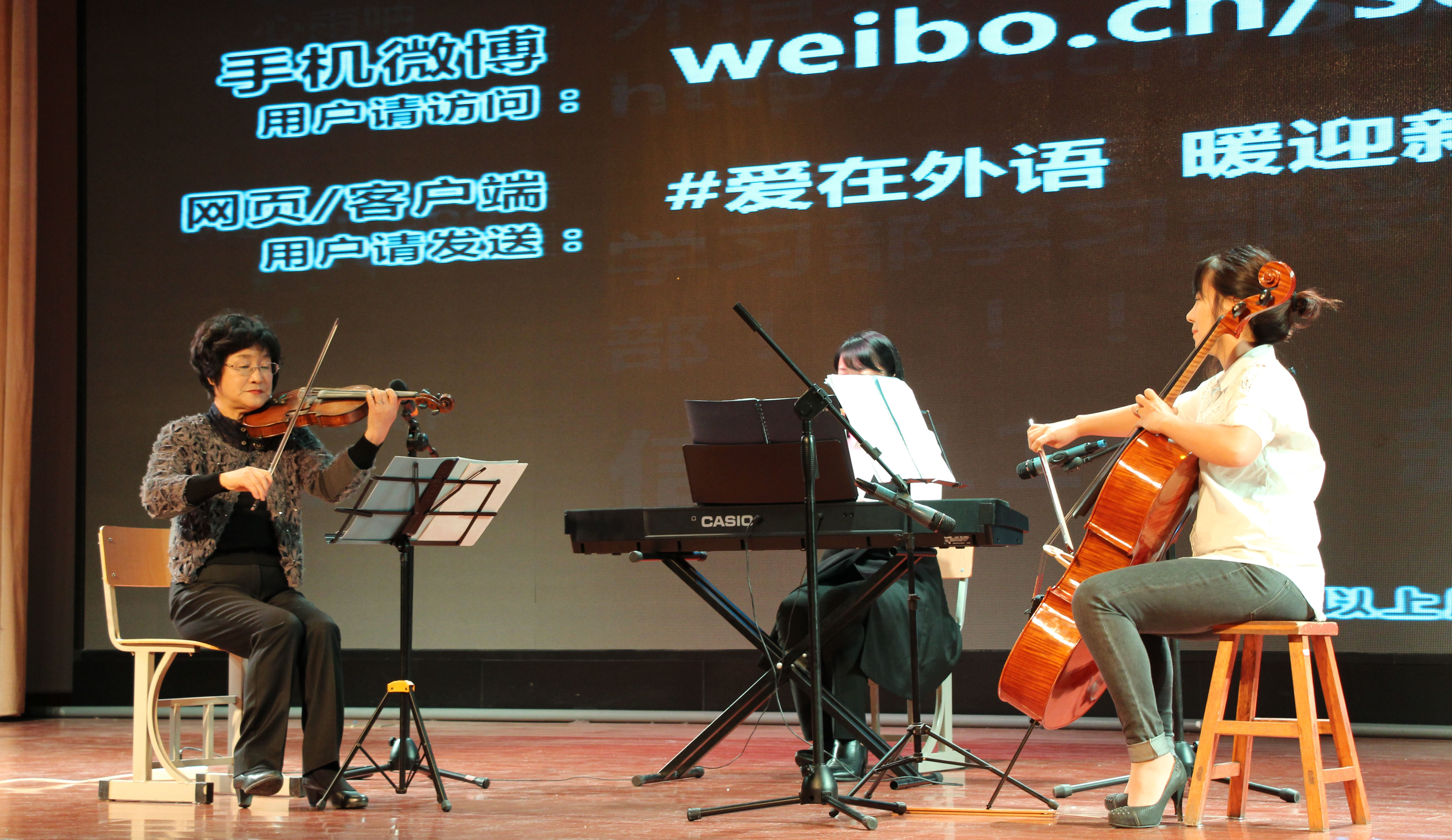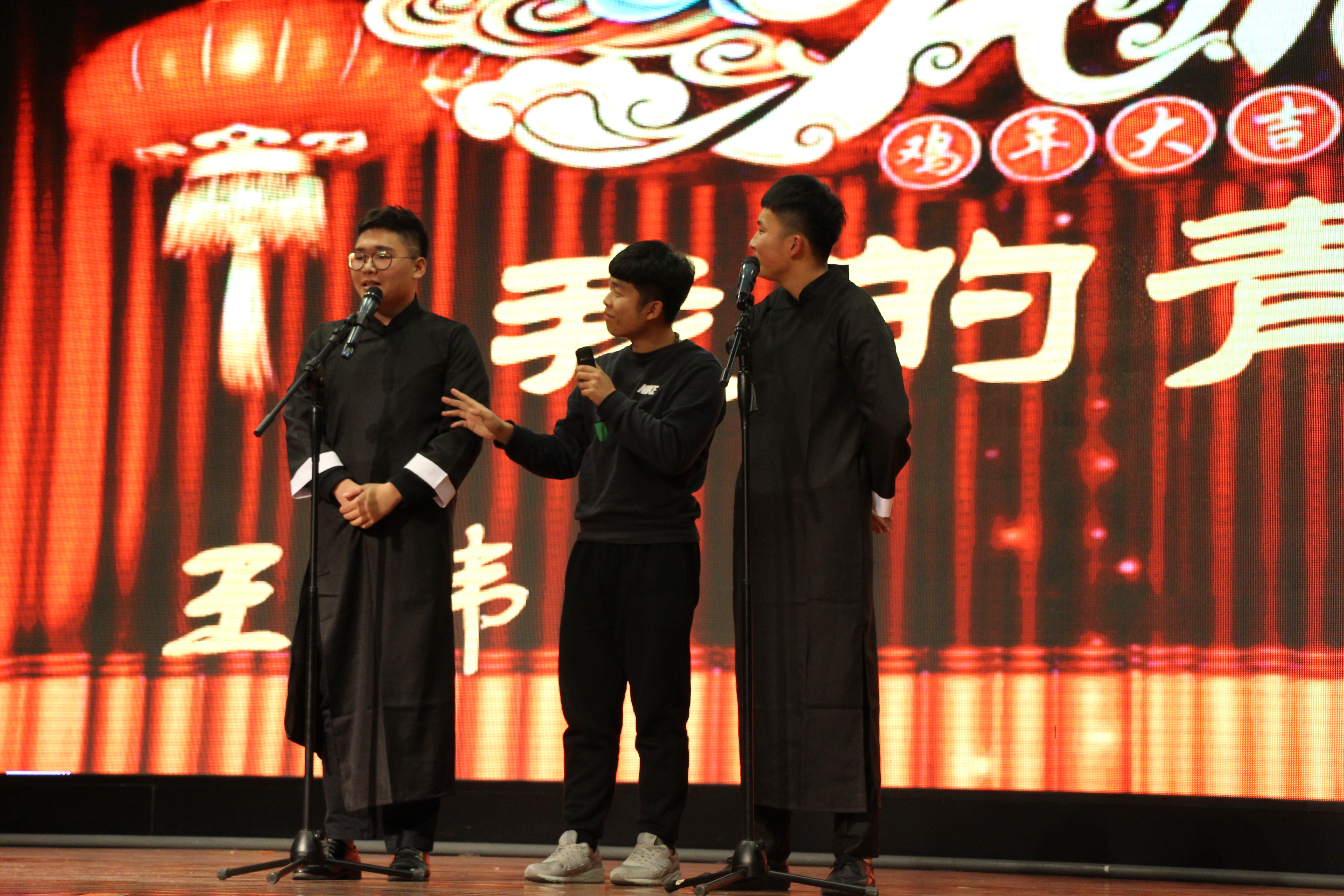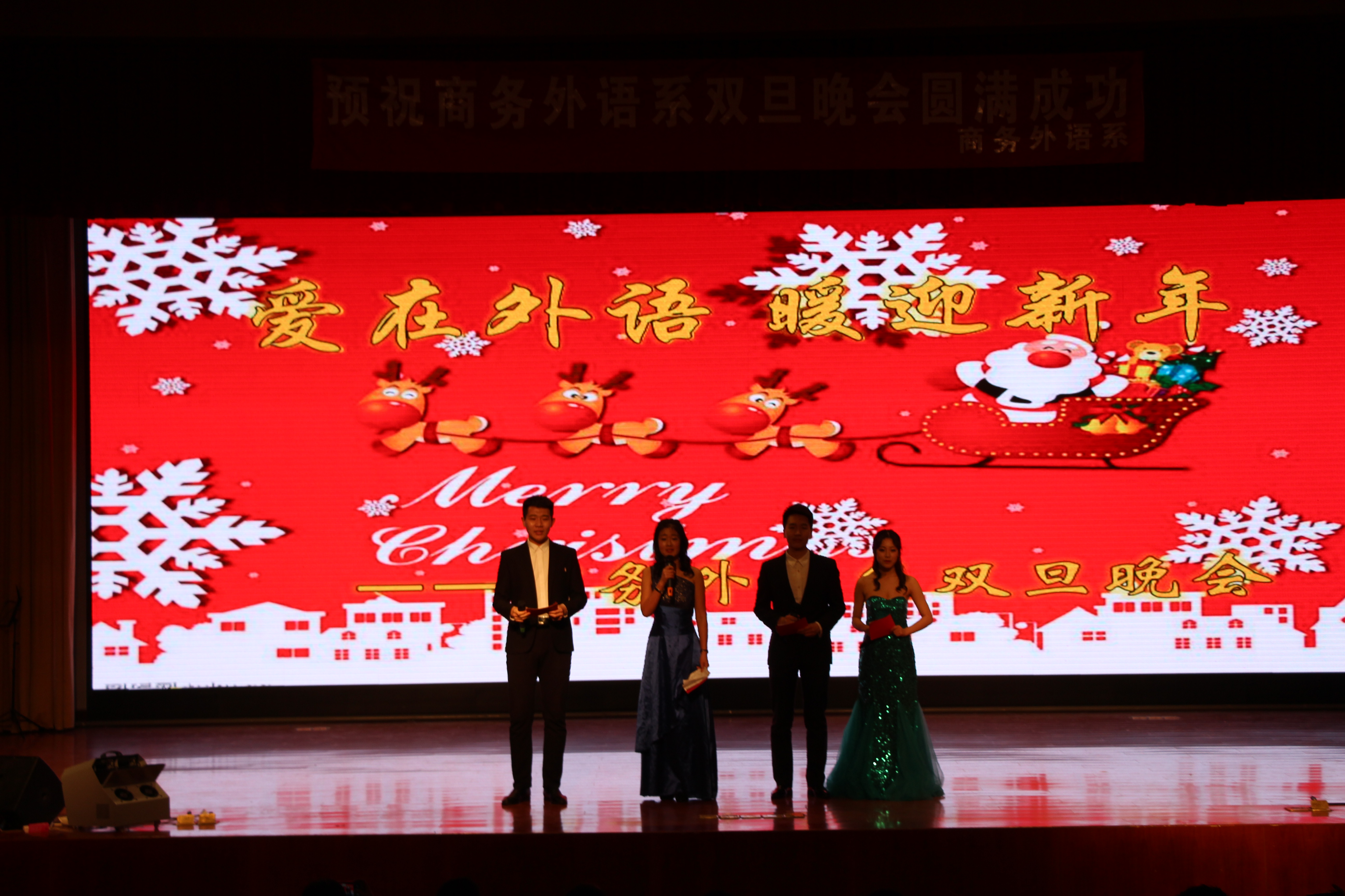 韩语外教悠扬的小提琴声拉开了整场晚会的帷幕。商务外语系党总支书记王治玲老师发表了新年祝福,对商务外语系过去一年做出了总结,对商务外语系新的一年表达了祝福。随后,同学们精心准备的节目轮番登台演出,节目有舞蹈、歌曲、小品、相声等多种多样的表演。低沉却又饱含深情的歌曲《蓝旗袍》与风趣幽默、独具特色的流行歌《蓝莲花》形成鲜明对比,给观众造成了极大的听觉冲击。舞念舞蹈《舞法舞天》以双人舞和团体舞《TT》以不同形式向观众展示了似火青春的激情与活力。小品《我要上春晚》在同学滑稽有趣的语言和动作中表现得淋漓尽致,令人捧腹。相声表演《我的青春》以诙谐幽默的语言与丰富多变的表情讲述了进去大学后对爱情、对学习的追求以及这一过程中的苦与乐。抽奖和送礼品环节更是将气氛推向一个有一个高潮。一首《再遇见》让这次活动接近尾声,最后在一首《WeWishYou aMerry Christmas》中,晚会圆满结束。(李蓉)