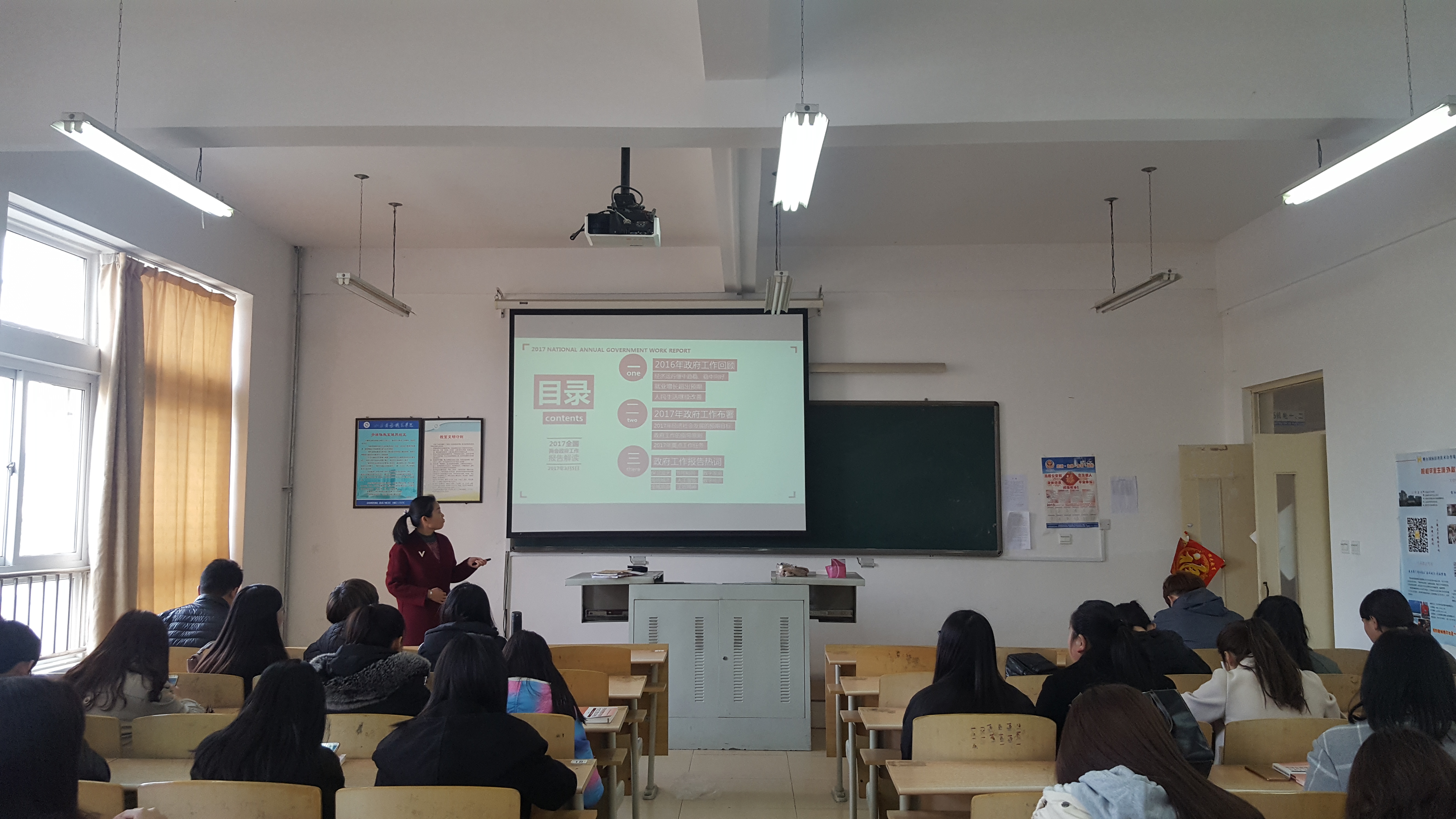 本站讯 3月5日,第十二届全国人民代表大会第五次会议在人民大会堂举行开幕会,国务院总理李克强作了政府工作报告。为深入贯彻习近平总书记系列重要讲话精神,推动党的理论创新最新成果进教材、进课堂、进头脑,我校思政部教师积极组织学习,结合本校和学生实际对政府工作报告进行了深入理解和全面把握,利用思政课堂向学生全面解读政府工作报告。
