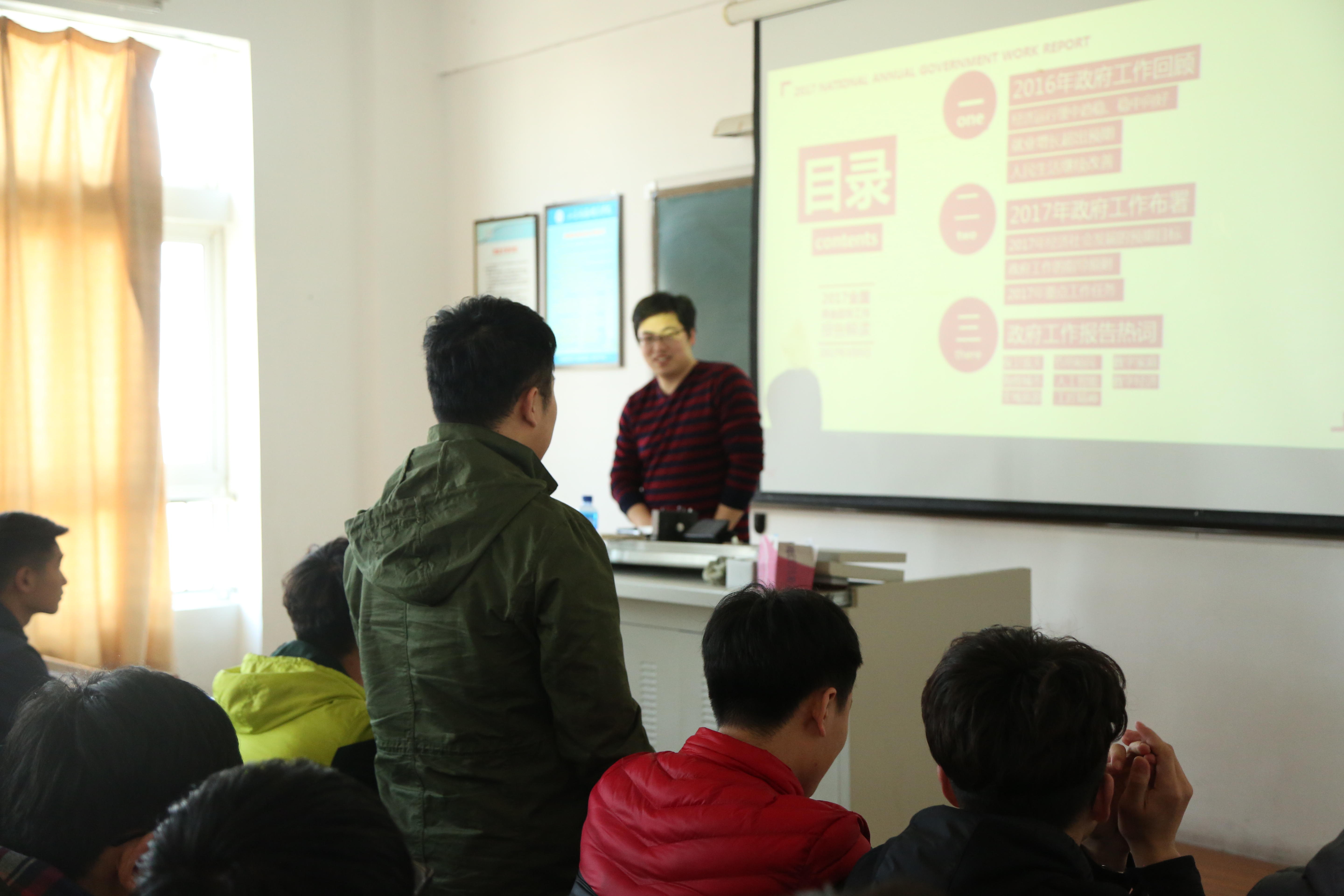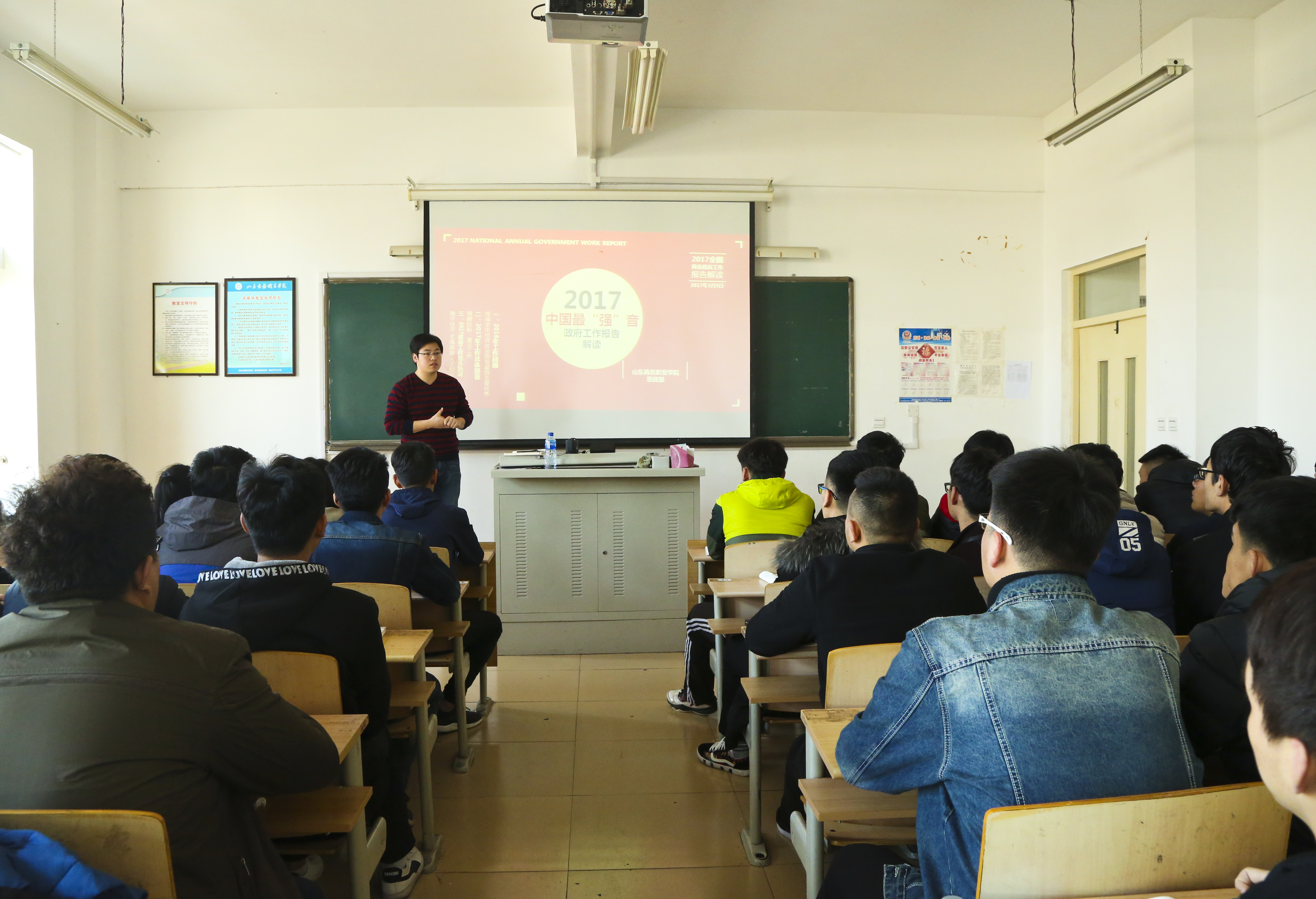 在专题解读中,从李克强总理对2016年我们取得的成就、2017年政府工作总体部署及工作原则和总理政府工件报告中的亮点、热词、金句等几个方面向学生们展开讲解,并积极与学生们进行互动,师生之间就2017年政府工作报告的内容展开了热烈讨论。