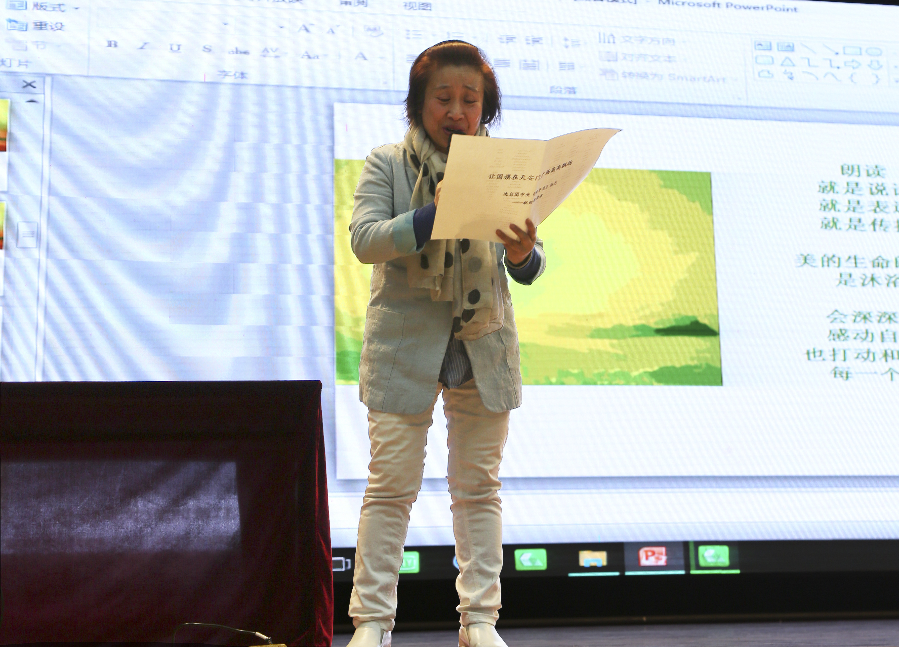 她为同学们播放了《让国旗在天安门高高挂起》这个视频,谈起自己第一次见到天安门国旗升起的那一刻,脑中只浮现“天降神兵,无与伦比”这一句话。现场的掌声不断,每一个人都在琉璃老师的带领下去朗读,随着朗读的进行,每一个学生也都感受到生命里传来的声音,就是自然、纯净、透明的声音。“刘丽老师宁静的力量感染了我,这种积极、正能量的言语很鼓舞人。”大学生记者团吴兴同学在随后的采访中表示。