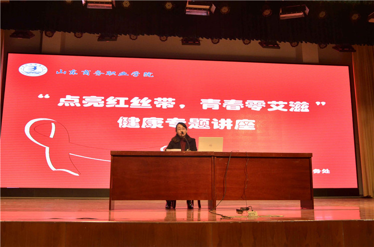 本站讯 在第30个世界艾滋病日到来之际,为普及艾滋病知识,增强学生防艾意识,倡导文明健康生活方式,11月28日下午,山东商务职业学院“点亮红丝带,青春无艾滋”健康知识主题讲座在学校音乐厅举行,系部辅导员及学生代表700余人聆听讲座。