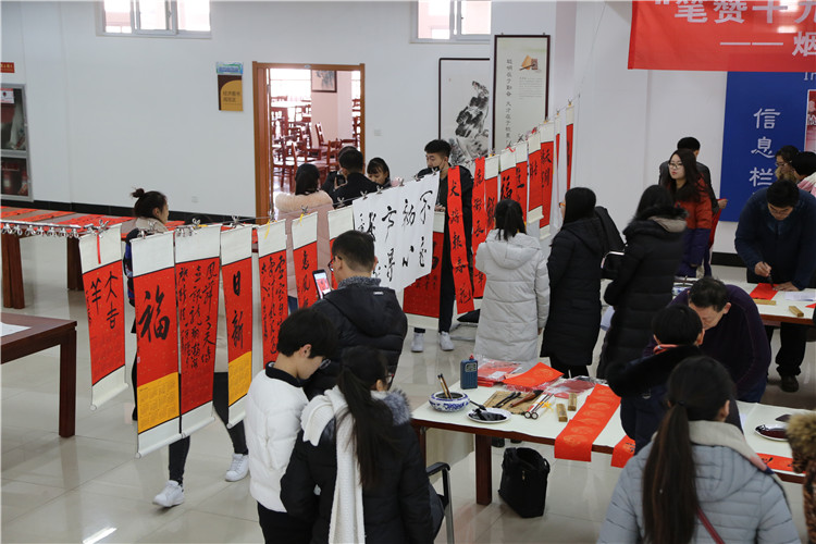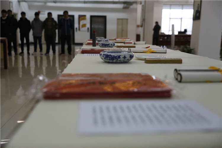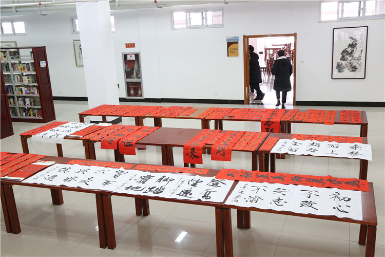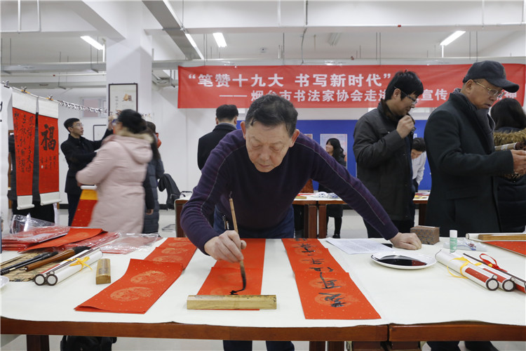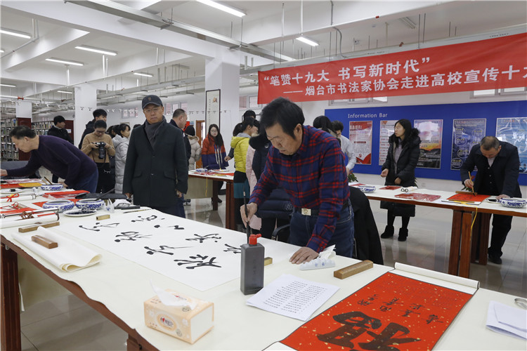 本站讯 2018年1月5日上午10时,我校图书馆二楼大厅翰墨飘香、丹青溢彩。一场以“笔赞十九大,书写新时代”为主题的书法活动在此举行。