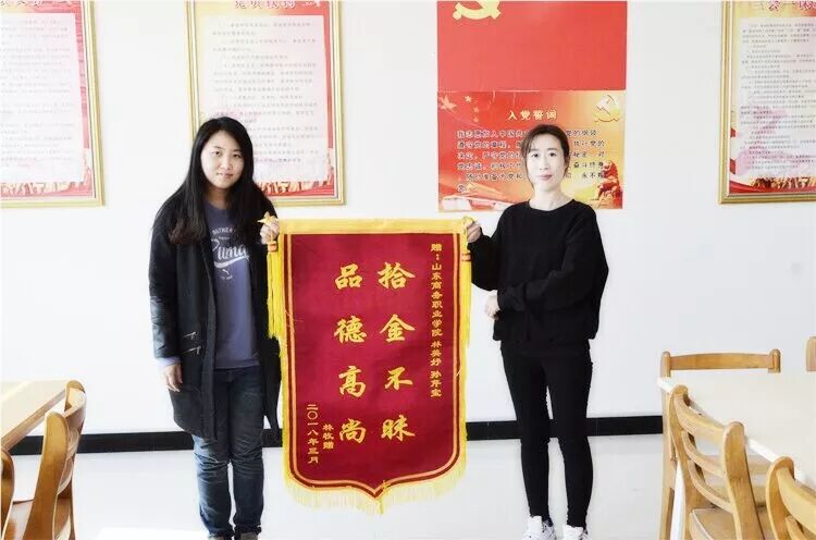 3月14日,学校建筑工程系教师林美妤收到了这样一幅锦旗,上面书写着“拾金不昧,品德高尚”八个字。失主林女士在感激之余制作锦旗送到学校,并拿出红包表示感谢,被林老师当场拒绝。林女士表示,“更让我感动的是,林老师在原地坚持等待了那么长的时间,太感谢了。我为山东商务职业学院有这样高修养、高素质的老师点赞,从今天开始,我也被你们学校圈粉了。”林女士真诚幽默地说。