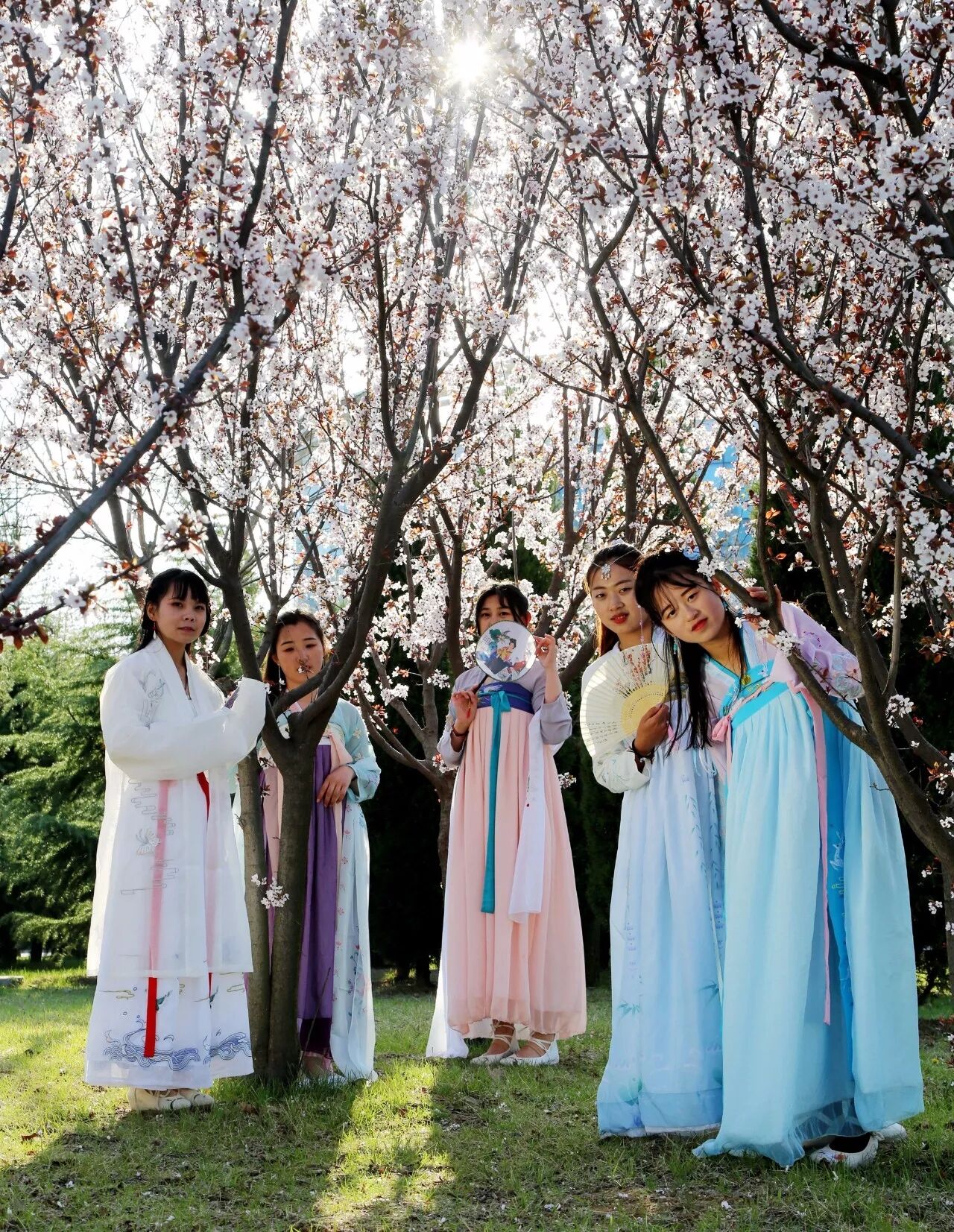 本站讯 4月17日,春天里的山东商务职业学院校园花团锦簇、弥漫花香。不过比花儿更吸引人的是一群正值妙龄的姑娘。她们身着不同形制的汉服,梳着结鬟,衣袂飘飘的走在师生中间。原来,这是该校青青子衿汉服文化社团在为农历三月三(4月18日)上巳节的宣传进行拍摄。